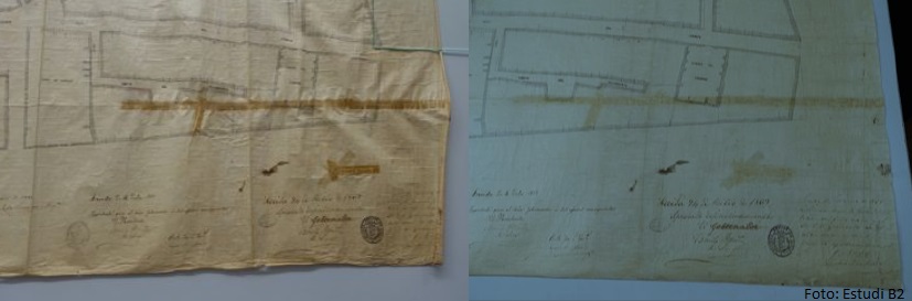 Els treballs han inclòs, entre altres operacions, la neteja en sec, la retirada del paper de consolidació, un tractament de taques així com l’aplanat i consolidació del suport. Aquesta restauració integral permetrà facilitar la consulta del plànol a experts i estudiosos. Les tasques han anat a càrrec de l’empresa Restauració d’Obra Gràfica, Estudi B2 SL.