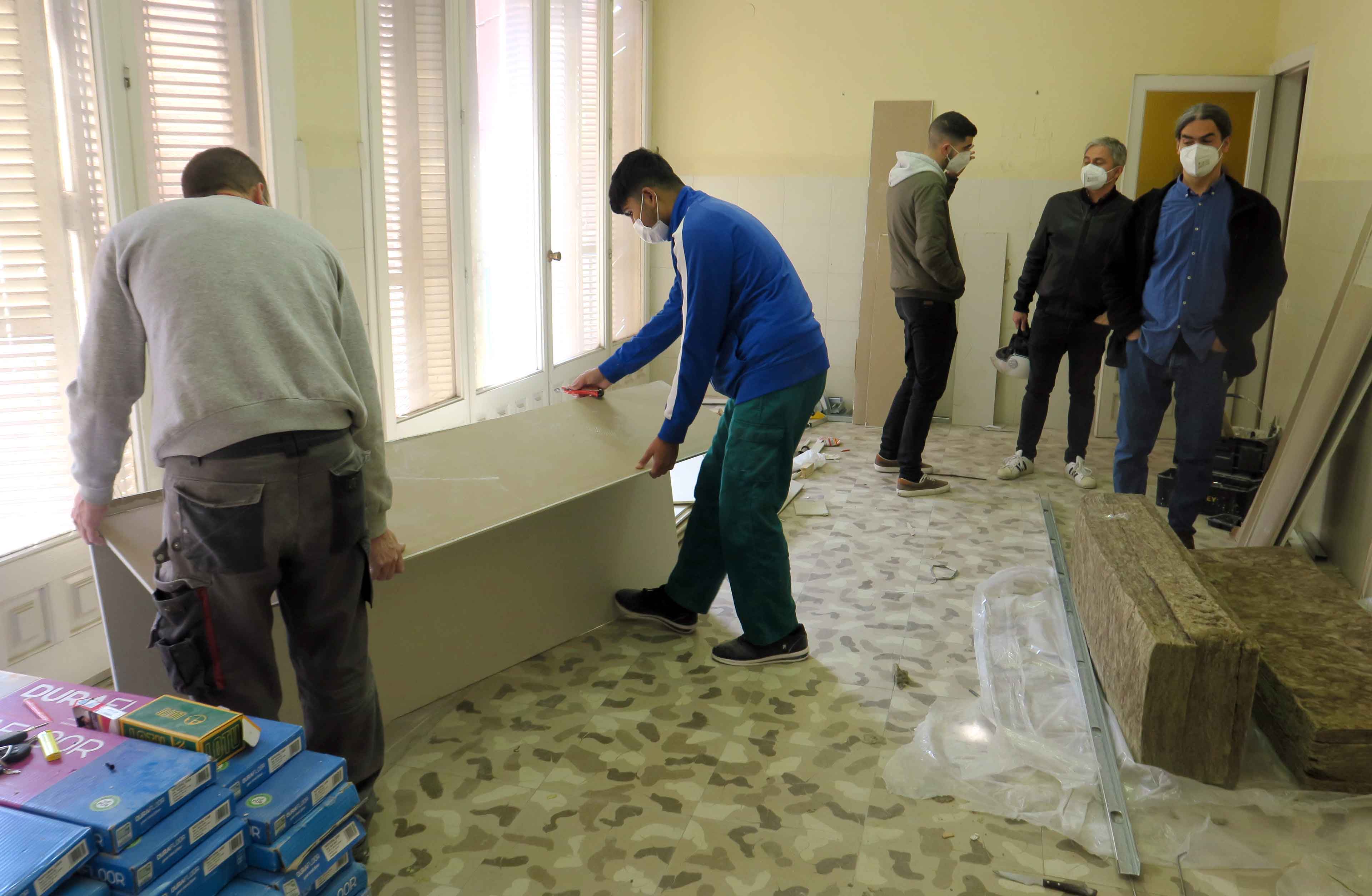 Cinc joves estan treballant, sota la supervisió d’un cap d’obra, en la rehabilitació d’un pis del barri de la Bordeta, que l’Empresa Municipal d’Urbanisme (EMU) ha cedit a l’associació Obrint Portes per l’Habitatge Social, perquè el gestioni dins del programa de masoveria urbana.