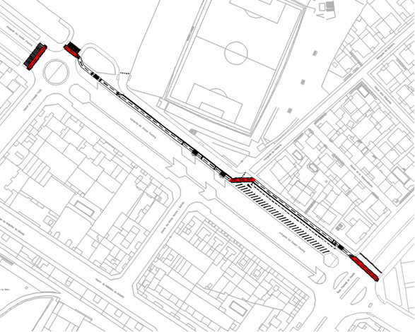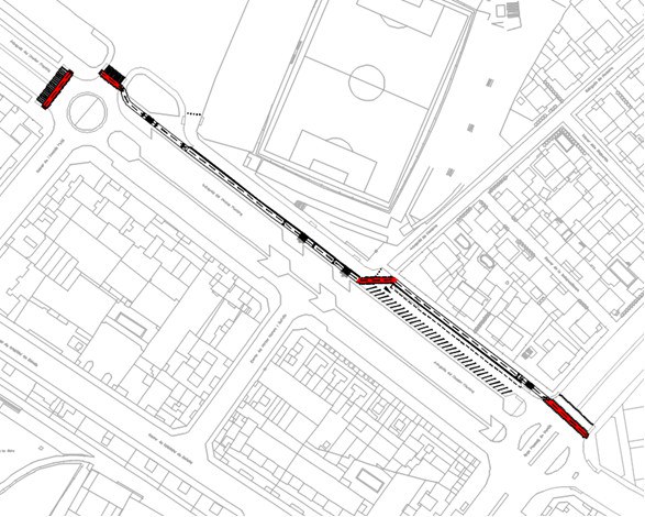 El carril bici passarà per la calçada que queda just al costat del Camp d’Esports, segregada tant del trànsit de vehicles com del pas de vianants per la vorera. En els trams on el carril bici creua la calçada estaran convenientment indicats amb senyalització horitzontal i amb pintura vermella antilliscant i també s’incorporaran els rebaixos a les voreres.