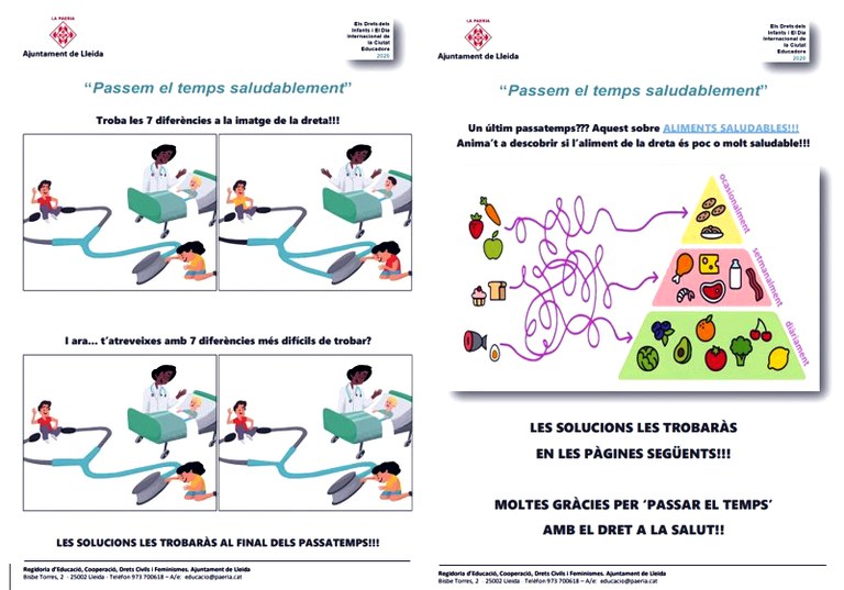 A la web de la Regidoria d’Educació de la Paeria es pot trobar aquest material per treballar-ho en família. Us adjuntem l’enllaç dels passatemps i les solucions: https://educacio.paeria.cat/passatemps_saludables