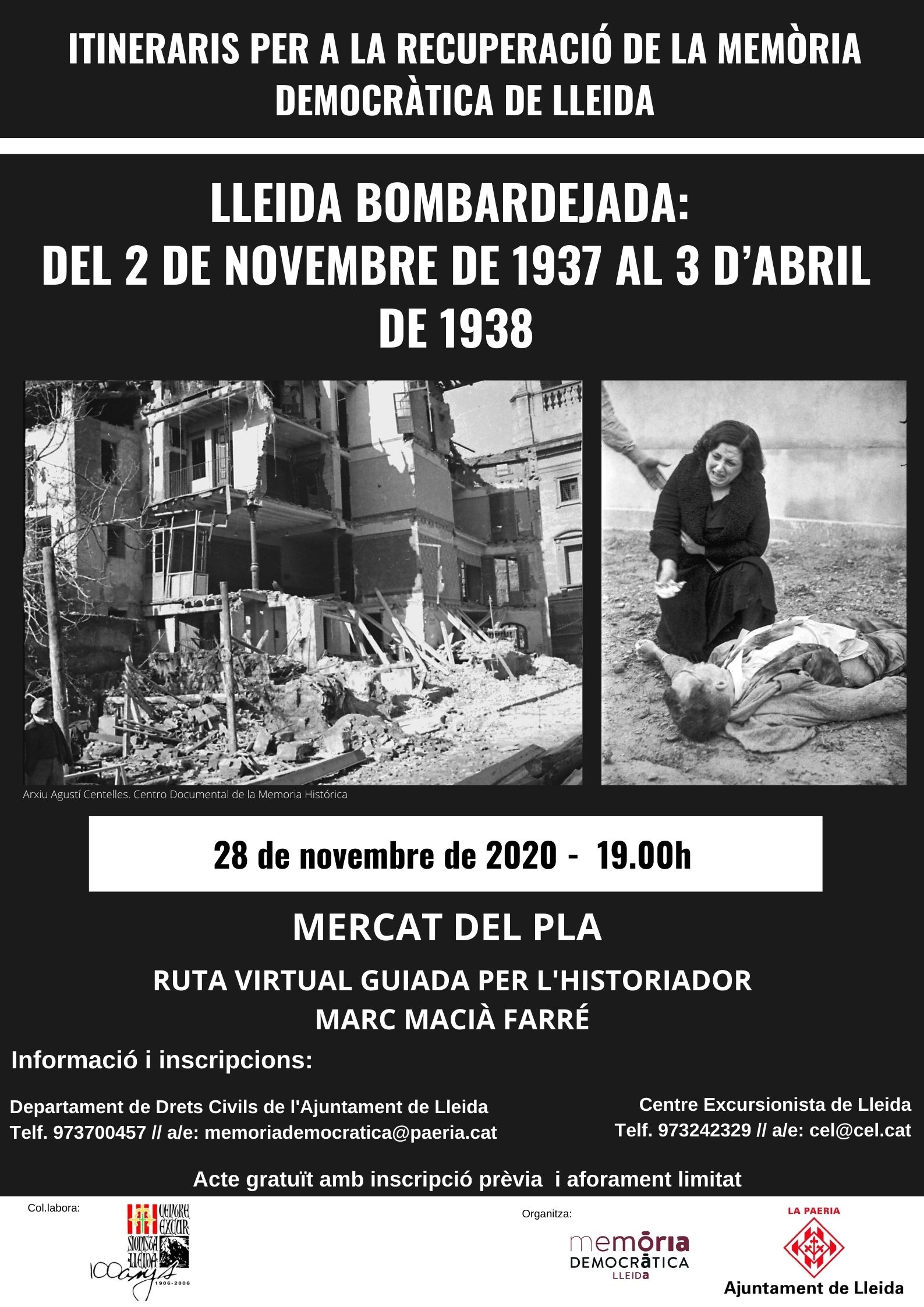 L’Ajuntament de Lleida organitza pel dissabte, 28 de novembre, un nou itinerari per a la Recuperació de la Memòria Democràtica. El Departament de Drets Civils ha preparat la ruta virtual per la “Lleida bombardejada: del 2 de novembre de 1937 al 3 d’abril de 1938”, un acte que tindrà lloc al Mercat del Pla, a les 7 de la tarda, i serà guiat per l’historiador Marc Macià Farré.