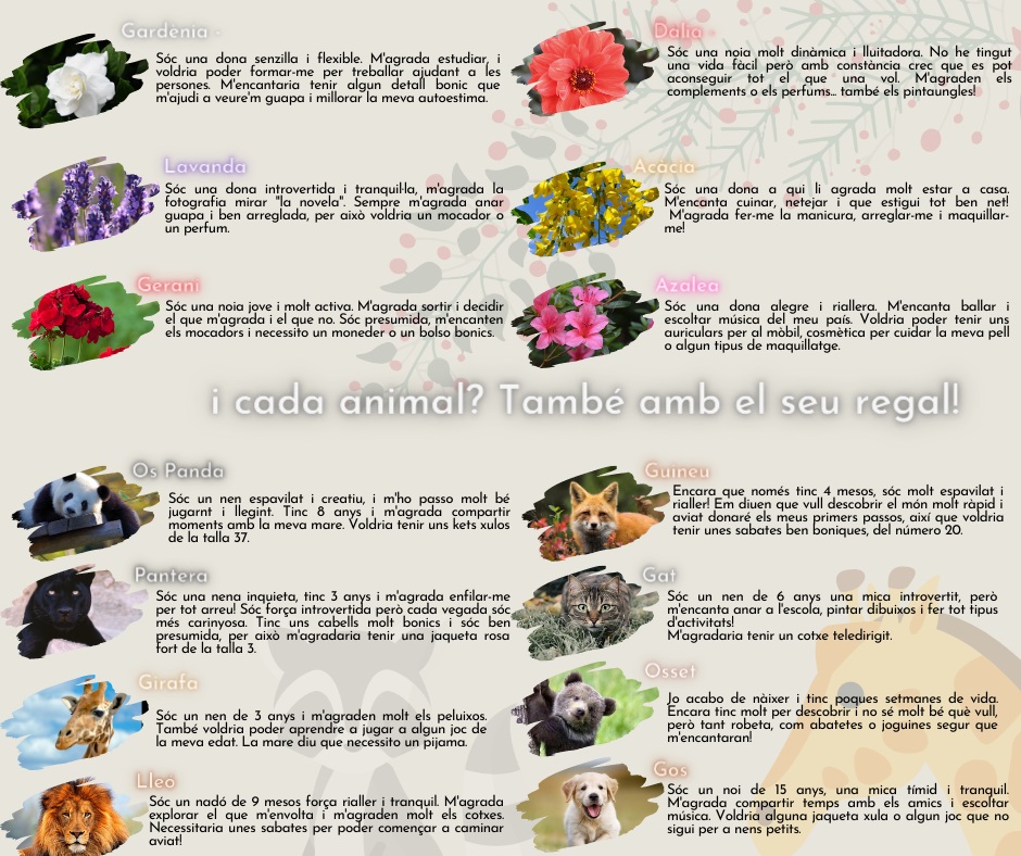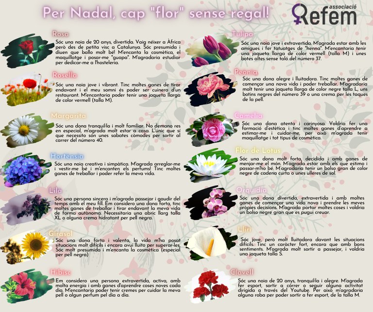 L’associació REFEM ha fet arribar els desitjos de les seves persones usuàries. Les dones ho han fet amb el pseudònim del nom d’una flor i els infants, amb el d’un animal, amb la descripció de la seva personalitat i de les coses que els agradaven. La tinent d’alcalde i regidora d’Ocupació i Responsabilitat Social, Anna Campos, ha explicat que els treballadors i les treballadores de l’IMO, de forma individual o col·lectiva, han escollit a quina flor o animal ‘apadrinar’ i fer possible el desig d’aquestes persones.