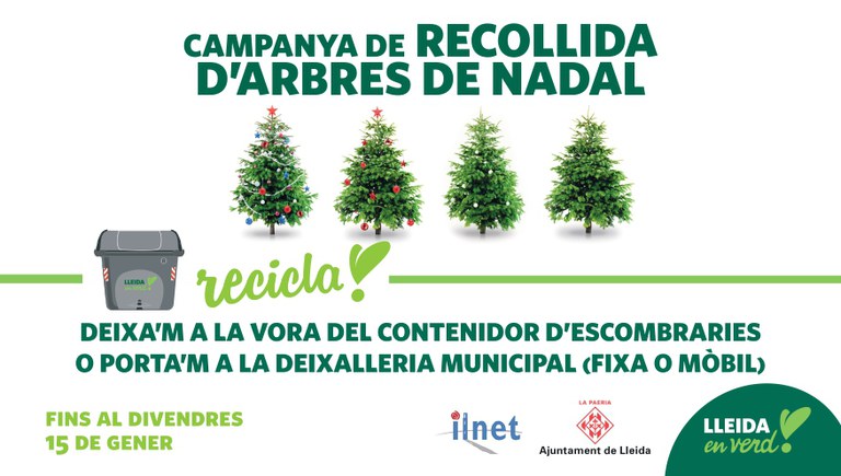 L’Ajuntament de Lleida fomenta el reciclatge amb la recollida d’arbres de Nadal, que promou cada any després de les festes. Des de demà, 5 de gener, i fins al divendres dia 15, la ciutadania pot deixar els arbres a la vora del contenidor d’escombraries o bé portar-los a la deixalleria municipal, tant fixa com mòbil. Els arbres recollits seran triturats i convertits en compost que servirà per adobar altres plantes i, d’aquesta manera, s’incorporen de nou al cicle de la natura.