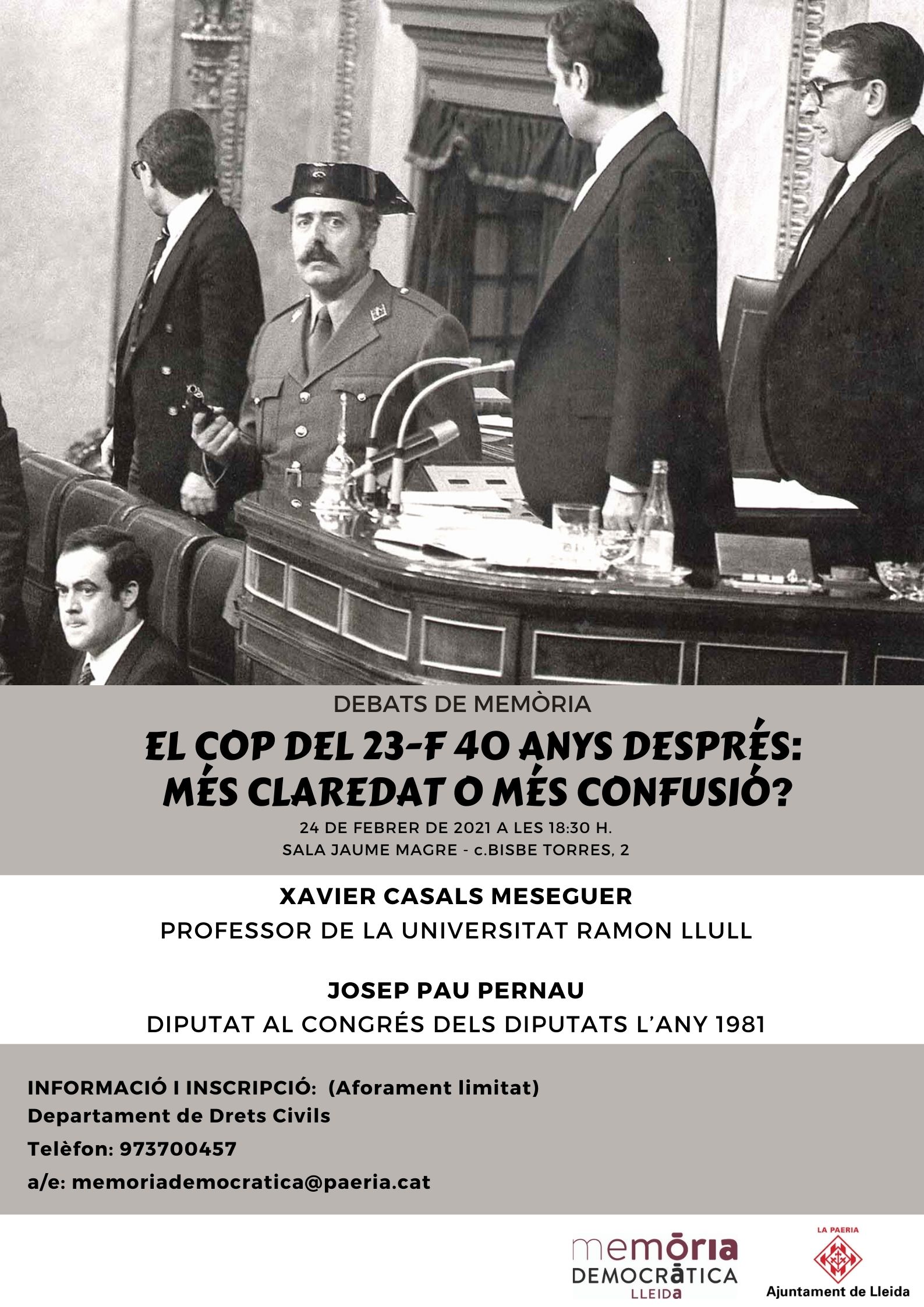 “El cop del 23-F 40 anys després: més claredat o més confusió?” és el títol del debat que el departament de Drets Civils ha organitzat per avui, en el marc del cicle Debats de Memòria. L’àrea de Drets Civils de l’Ajuntament de Lleida ha preparat per aquesta tarda la xerrada, que comptarà amb l’historiador Xavier Casals Meseguer i l’exdiputat Josep Pau Pernau. Enguany es compleixen els quaranta anys de l’intent de cop d’estat, amb l’ocupació del Congrés dels Diputats per membres de la Guàrdia Civil comandats pel tinent coronel Antonio Tejero i els posteriors moviments de tropes que es van produir en diferents casernes militars del país.
