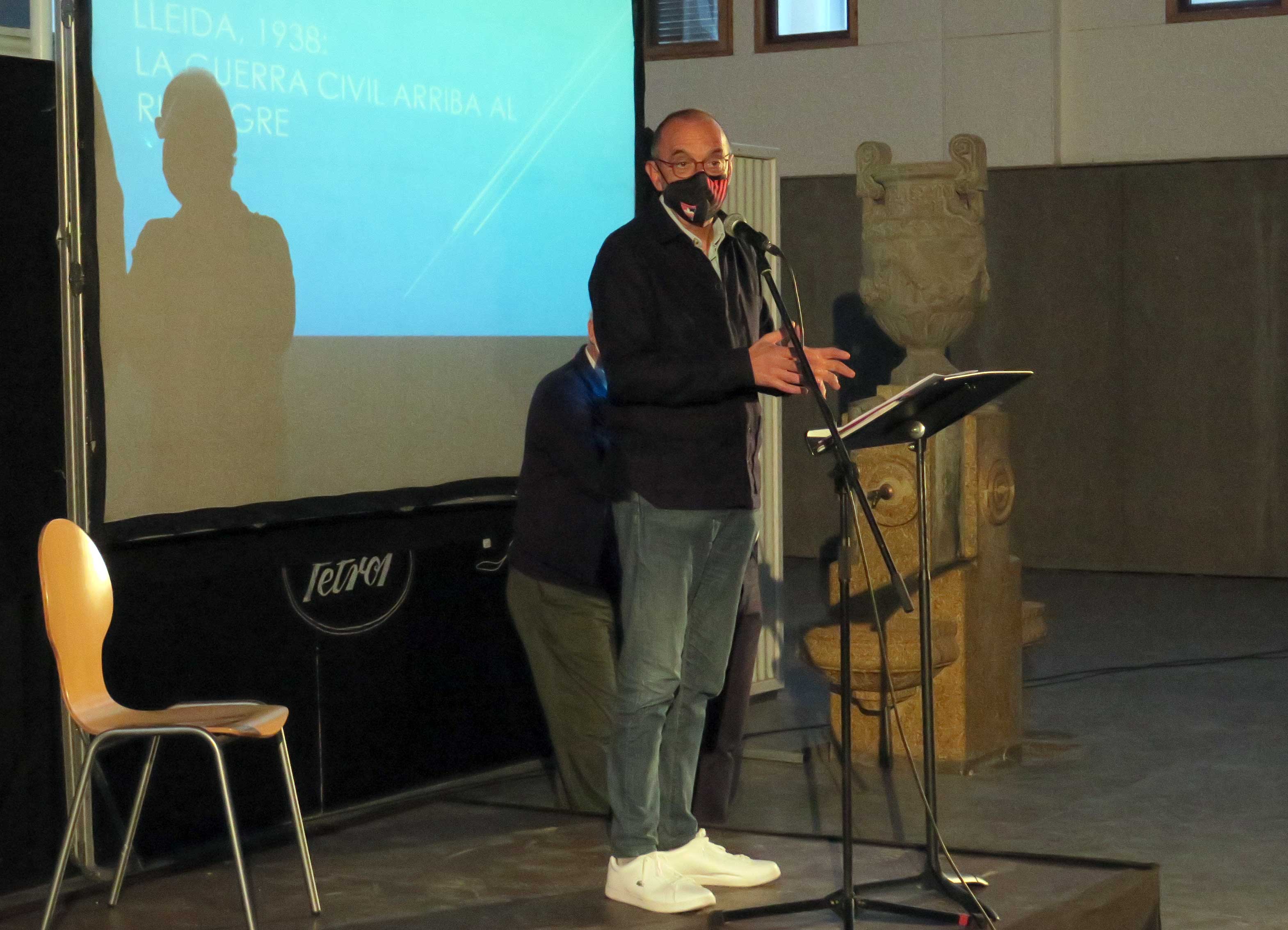 L'alcalde de Lleida, Miquel Pueyo, dóna la benvinguda als assistents a la xerrada de Pol Galitó sobre el front del Segre i anima a seguir treballant i investigant sobre aquesta línia del riu, que a més de ser un potencial paisatgístic i identitari ha estat escenari de fets històrics