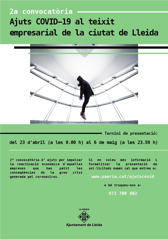 Les sol·licituds es poden presentar electrònicament, a partir de la propera mitjanit, (00.01 h de divendres, 23 d’abril), a través de https://www.paeria.cat/ajutscovid que us porta a l’E-Seu de l’Ajuntament de Lleida.
