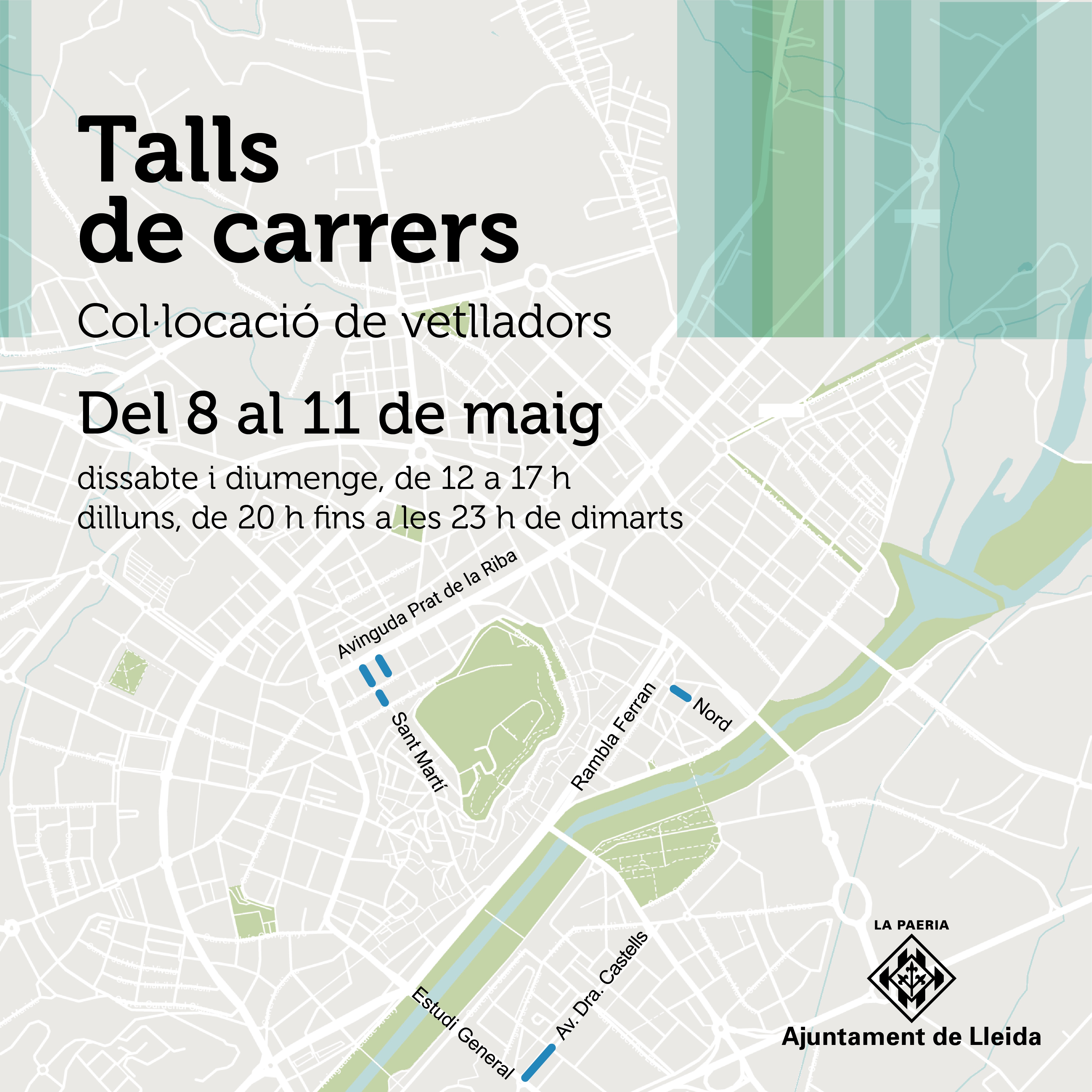 L’Ajuntament de Lleida tallarà quatre vies de la ciutat aquest pont festiu, del 8 a l’11 de maig, amb motiu de la Festa Major de la ciutat i per a facilitar la instal·lació de vetlladors per part de bars i restaurants. Donat que el dia 11 de Maig és la festivitat de Sant Anastasi, patró de Lleida, els horaris s’han ampliat als quatre dies, ja que, a més, el diumenge és el darrer dia de vigència de l’estat d’alarma i els bars i restaurants podran tancar més tard. A Catalunya, l’horari per aquests locals s’ha allargat fins les 23 h. El regidor de Mobilitat, Vialitat, Trànsit i Horta, Joan Ramon Castro, ha assenyalat que la Paeria intenta facilitar mesures d’aquest tipus per ajudar el sector de la restauració perquè puguin anar recuperant la normalitat.