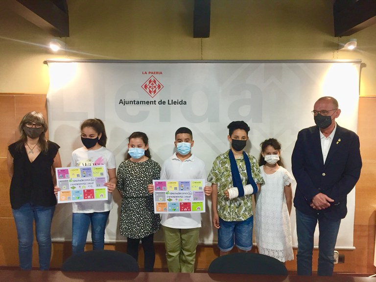 L’alcalde de Lleida, Miquel Pueyo, i la tinenta d'alcalde i regidora d’Educació, Sandra Castro, s’han reunit avui amb un grup d’escolars i professorat del centre, que els han explicat la seva proposta basada en el lema Construïm Espais d’Aprenentatge i Salut.