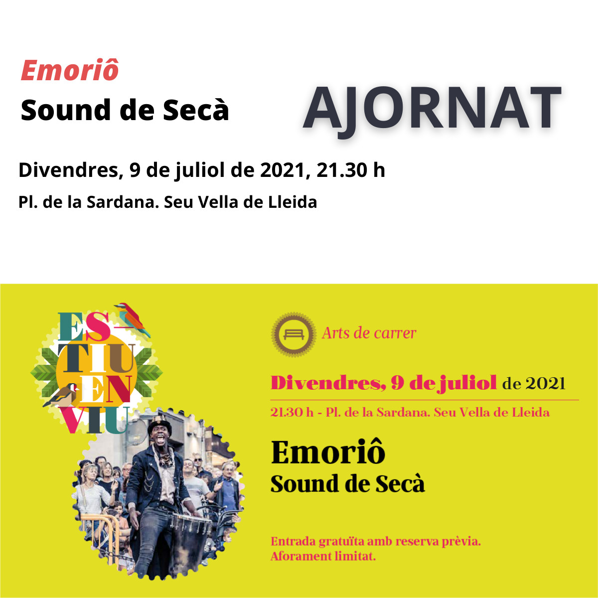 L’espectacle “Emoriô” que havia d’oferir Sound de Secà aquest divendres, 9 de juliol, a les 21.30 hores, a la plaça de la Sardana de la Seu Vella, en el marc de la programació de l’Estiu en Viu s’ha hagut d’ajornat per motius de salut d’alguns membres del grup. La Paeria treballa per reprogramar-lo en una altra data.