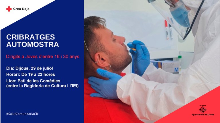El Departament de Salut de la Generalitat, Creu Roja i l’Ajuntament de Lleida, a través de les regidories de Salut i Joventut, repetiran el 29 de juliol, per tercera vegada aquest mes, el cribratge adreçat a joves de 16 a 30 anys per a detectar i tallar la cadena de contagis de la Covid  que s’estan produint a la ciutat.