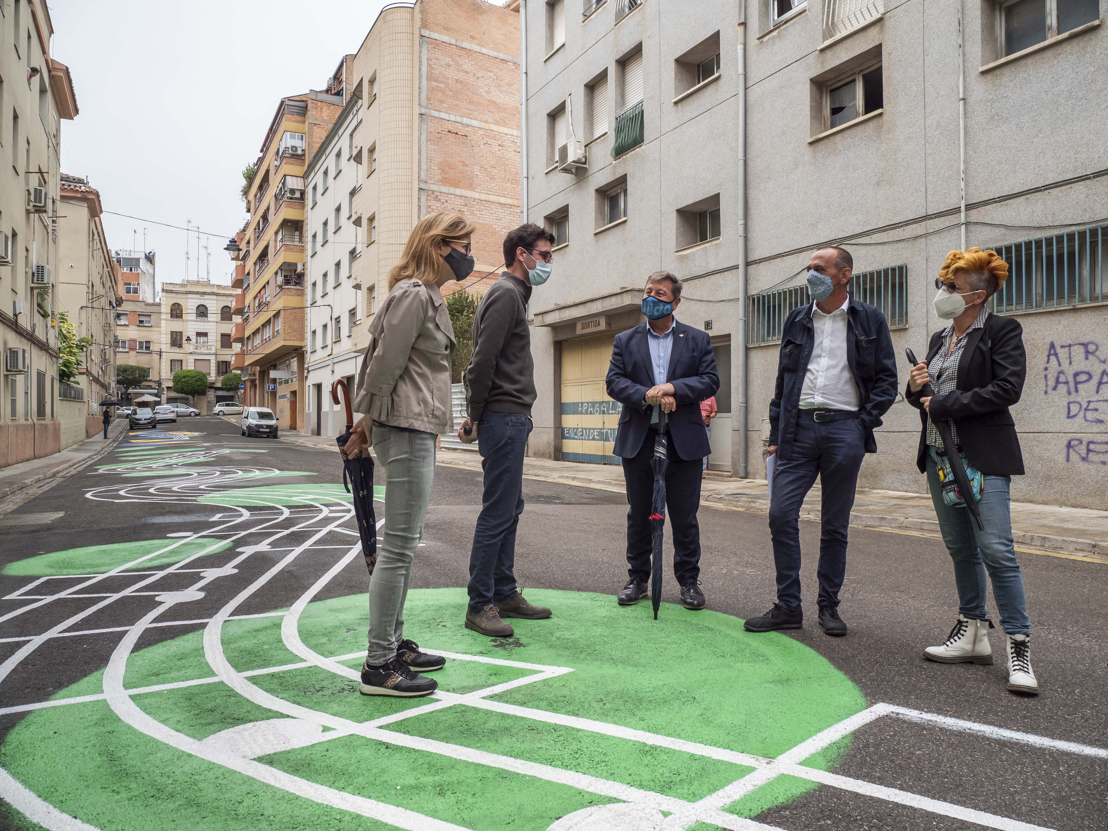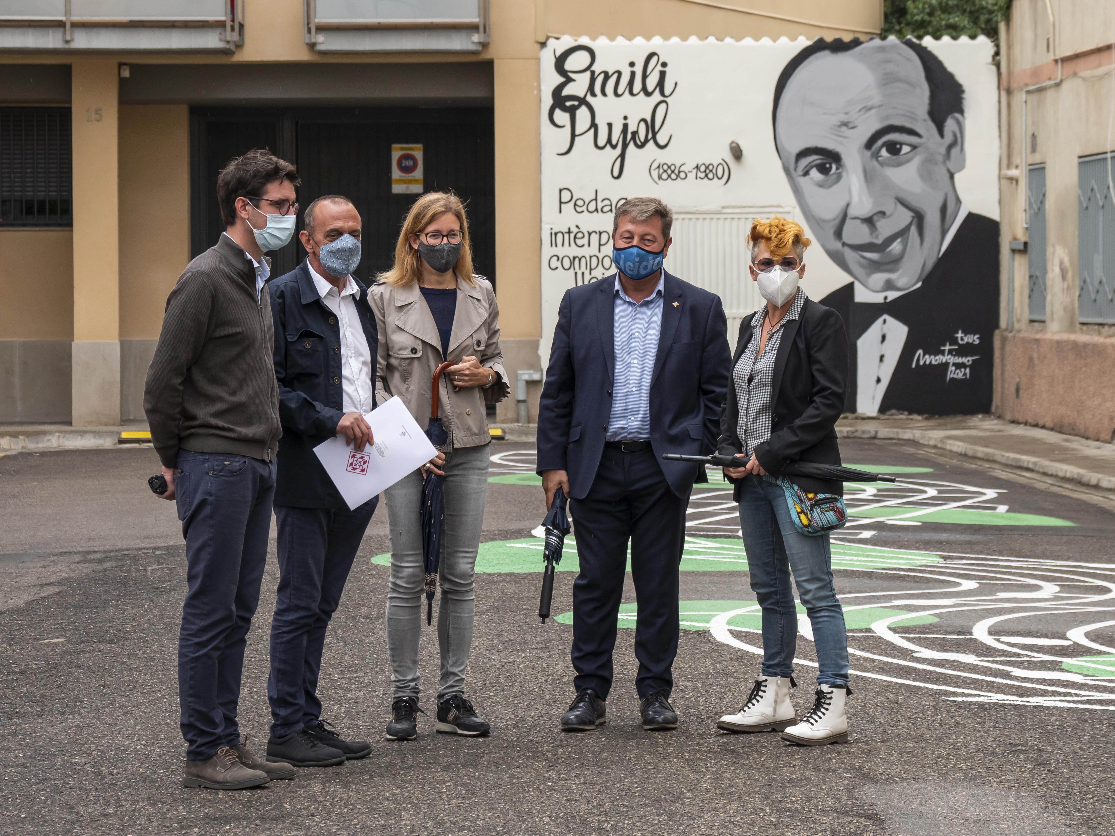 Toni Postius ha explicat que els treballs han consistit a senyalitzar la vianalització; s’han col·locat uns aparcabicis i s’ha afegit un mural en homenatge a la figura que dona nom a aquest carrer, el Mestre Emili Pujol. L’autora de l’obra és la muralista Txus Montejano, que ha plasmat un retrat del compositor i pedagog en un mur d’aquest carrer. La seva proposta artística també arriba a la calçada, on s’ha pintat el pentagrama d’una composició, una guitarra i altres elements gràfics.