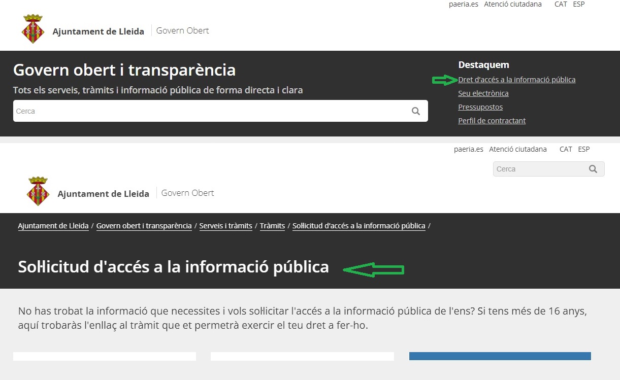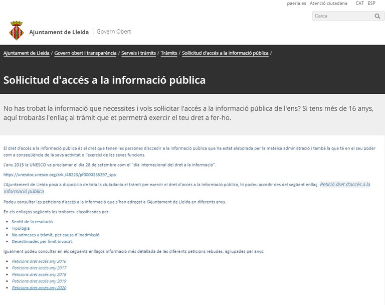 L’Ajuntament de Lleida ha incorporat millores a la pàgina web de Transparència perquè la ciutadania pugui accedir d’una manera més àgil i directa a informacions del seu interès. Basant-se en el dret d’accés a la informació pública, una de les opcions que cal destacar és un tràmit que permet exercir aquest dret i a través del qual pots sol·licitar l’accés a informació pública de l’ens. Per fer-ho, cal registrar la petició, com s’explica en aquest apartat, on també hi ha referències a peticions registrades anteriorment, així com la normativa a què fa referència, entre altres.
