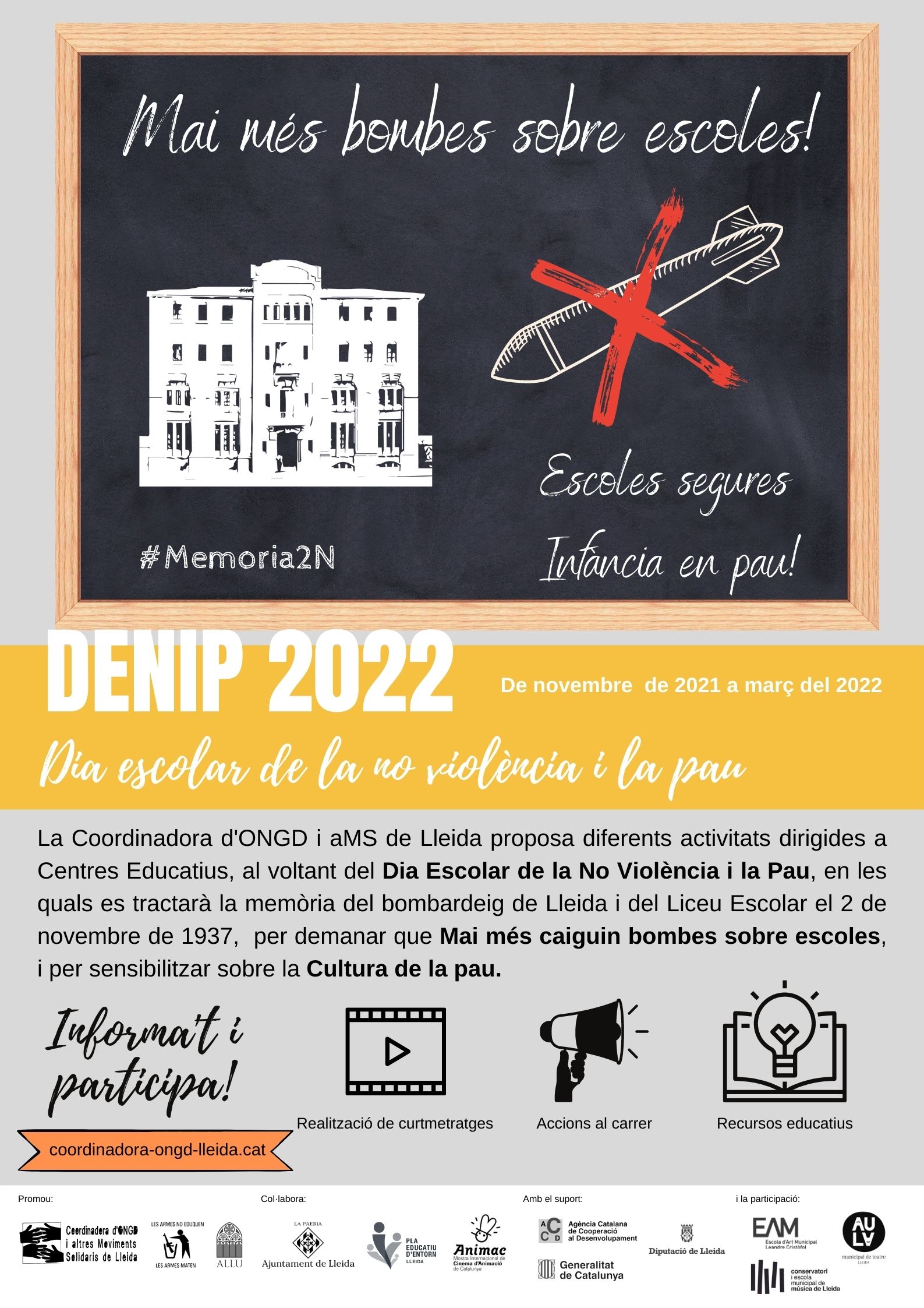 La Coordinadora d'ONGD i aMS de Lleida, la plataforma Desmilitaritzem l’Educació, l’Assoc. Lleida per la Unesco i l'Ajuntament de Lleida col·laboren en una proposta dirigida a centres educatius amb l’elaboració de curtmetratges, que es projectaran a l’Animac, i accions a les places de la ciutat el 28 de gener Amb el lema del 2022 “Mai més bombes sobre escoles” es vol treballar la seguretat a l’escola i dels infants i els drets a l’educació i a una infància en pau