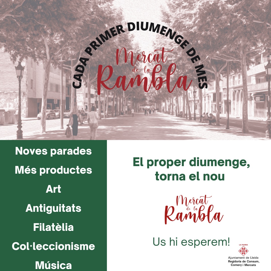 El Mercat de la Rambla és un model renovat, des del passat mes de setembre, i pensat per crear nous dinamismes en aquesta zona de la ciutat. Es desplega cada primer diumenge de mes i ja compta amb una quarantena de paradistes entre artistes, col·leccionistes, música o antiguitats que conjuguen amb l’oferta de terrasses de la zona.