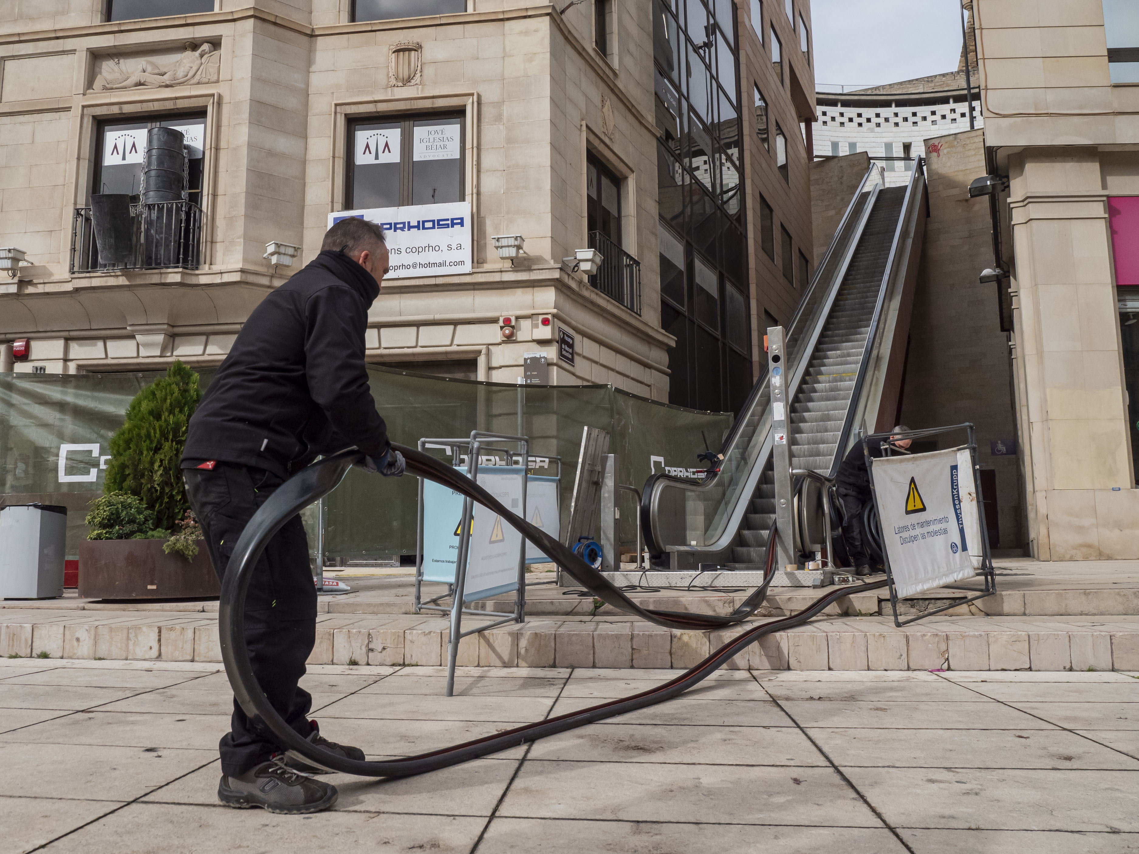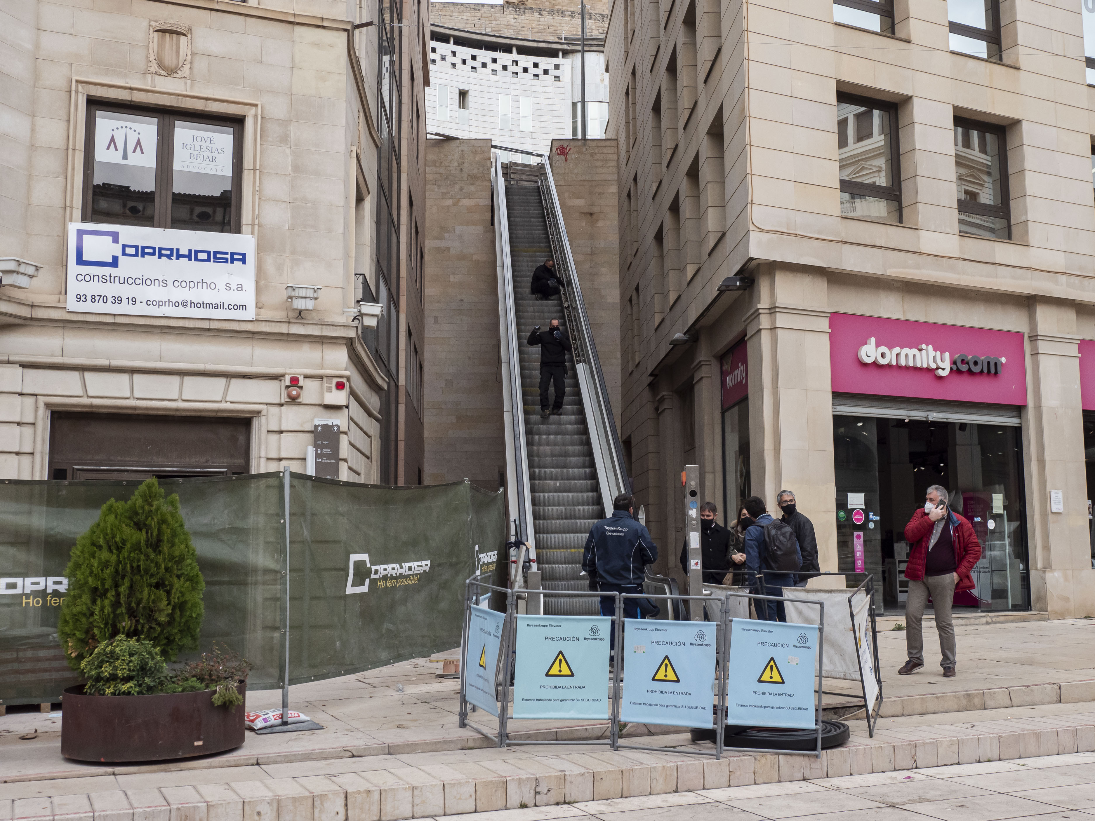 El paer en cap, Miquel Pueyo, i el primer tinent d’alcalde, Toni Postius, han visitat les obres de renovació de les escales mecàniques de la plaça Sant Joan que estaran enllestides abans de Nadal.