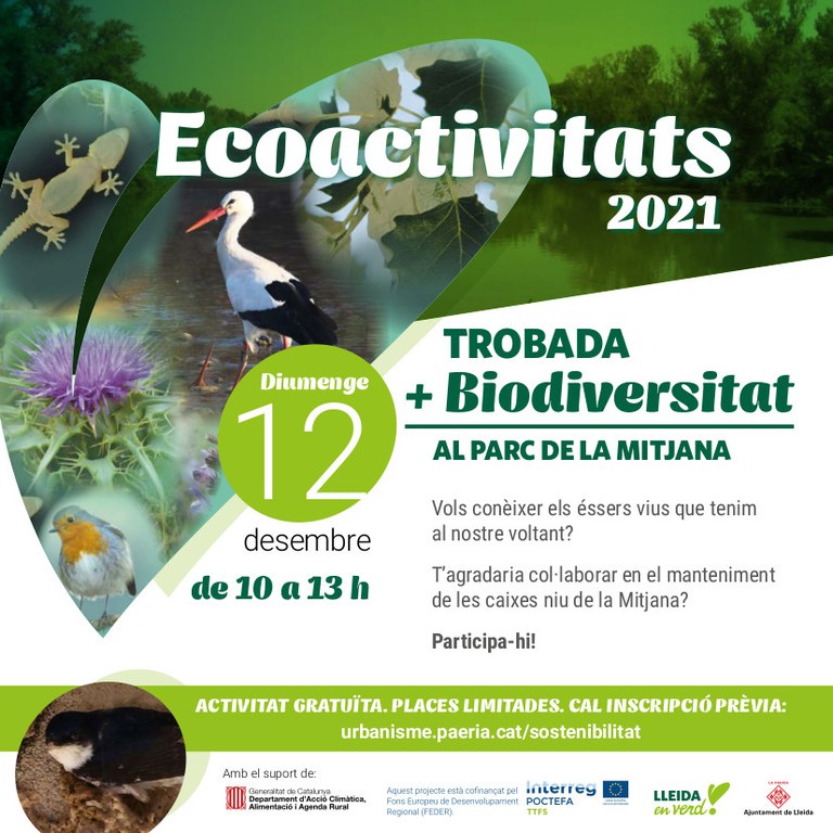 La Regidoria de Cultura, Ciutat i Transició Ecològica de l'Ajuntament de Lleida organitza per al pròxim diumenge 12 de desembre una nova trobada del programa +Biodiversitat al parc de la Mitjana, que té l'objectiu de sensibilitzar a la ciutadania sobre la importància de la biodiversitat urbana i motivar la seva implicació en el seu estudi i conservació.