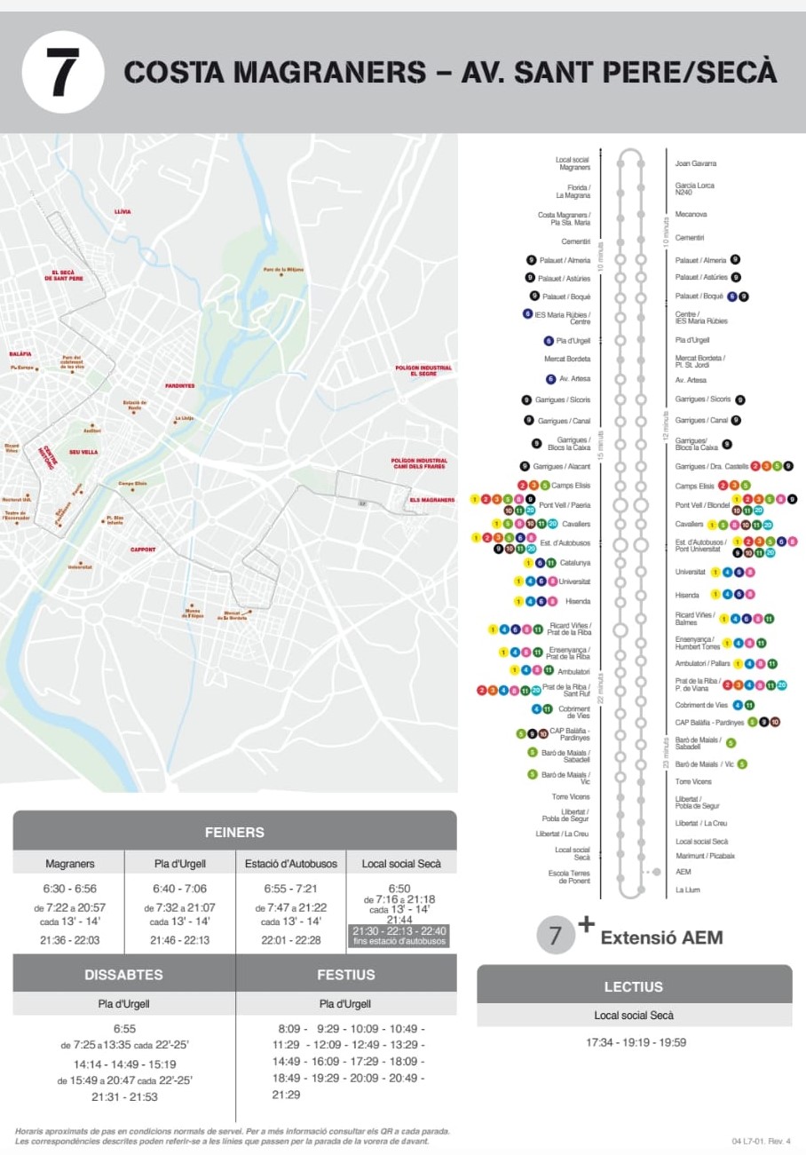Pel que fa a la L-7, que cobreix el trajecte entre la Costa de Magraners i l’avinguda de Sant Pere, al barri del Secà, els autobusos urbans circulen els dies festius cada 90 minuts. Ara bé, el pròxim dilluns i dimecres, la itinerància en el servei serà només de 25 minuts, el mateix temps que en l’horari dels dissabtes.
