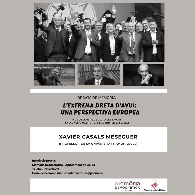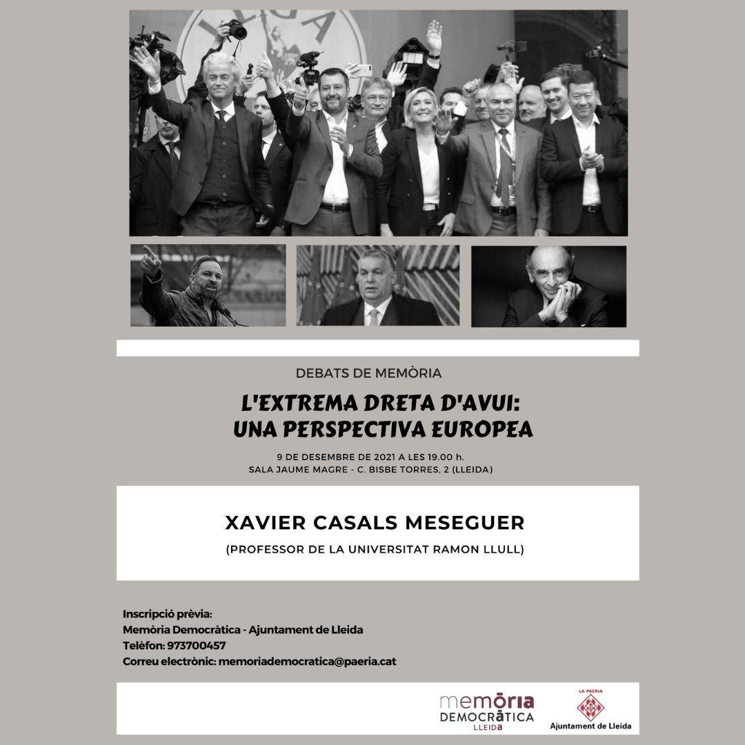 Per tal donar resposta a tots aquests múltiples interrogants, l’àrea de Memòria Democràtica de l’Ajuntament de Lleida ha organitzat aquesta conferència a càrrec d’un dels millors especialistes en l’extrema dreta política, Xavier Casals Meseguer, professor d’història de la Universitat Ramon Llull.