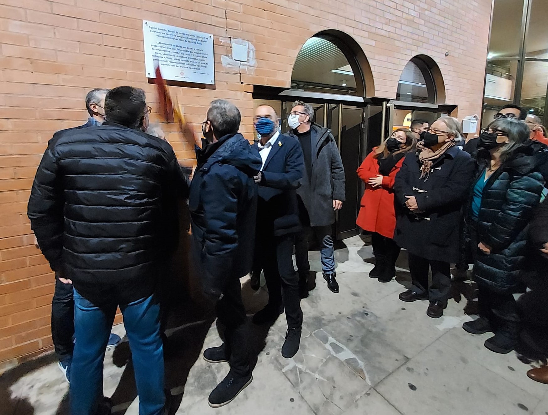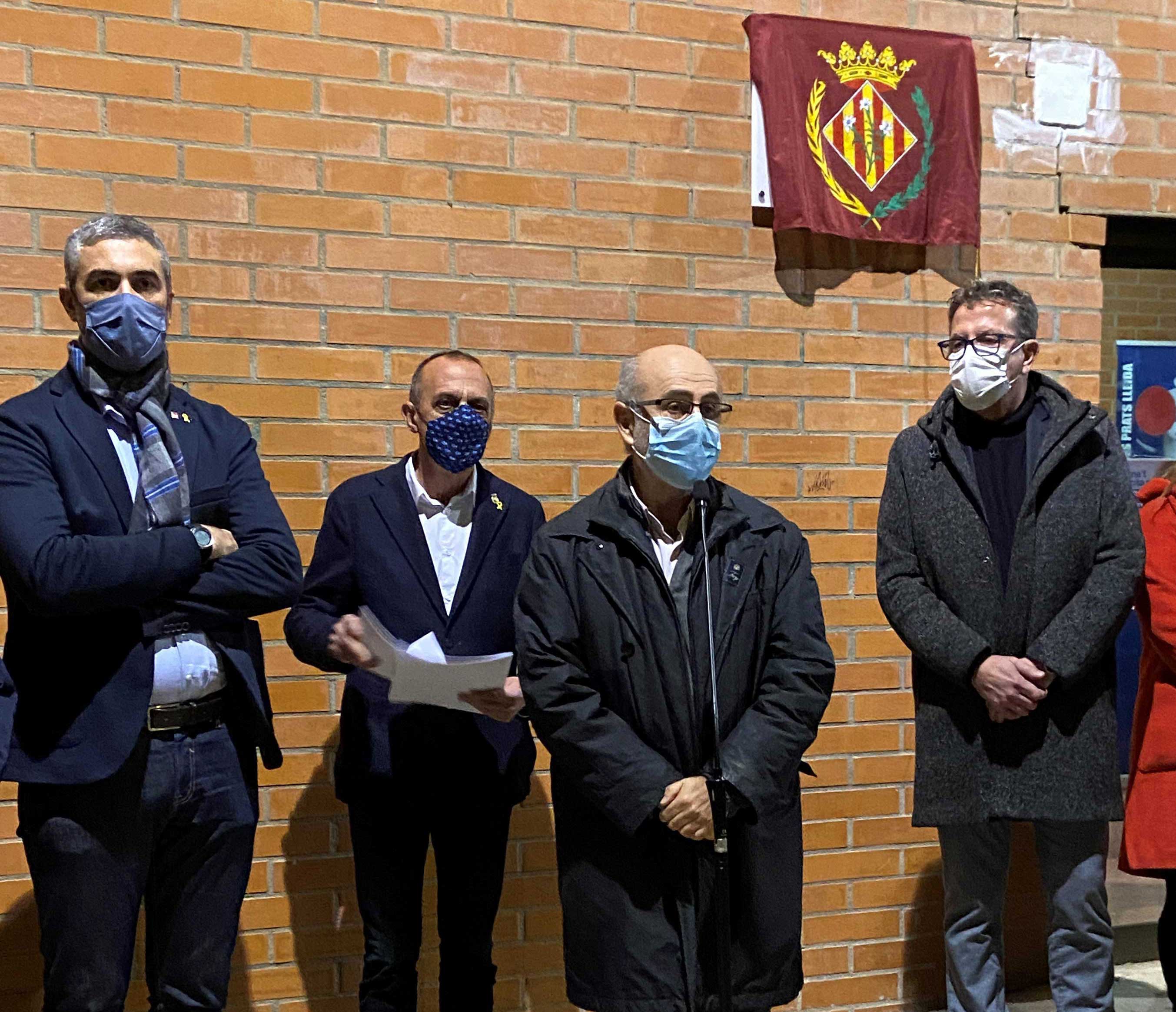 El paer en cap, acompanyat del delegat de Salut, Josep Pifarré; el president de la Diputació, Joan Talarn; el delegat del Govern, Bernat Solé, i els presidents i responsables de les entitats i clubs esportius usuaris del Pavelló Onze de Setembre, ha descobert la placa que recordarà l’efemèride abans que s’iniciés el partit d’hoquei de l’Europe Cup entre Finques Prats Lleida i Noisy Le Grand de París.