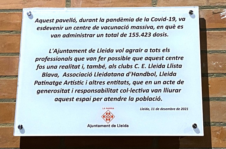La placa recull aquest text: “Aquest pavelló, durant la pandèmia de la COVID-19, va esdevenir un centre de vacunació massiva, en què es van administrar un total de 155.423 dosis.
