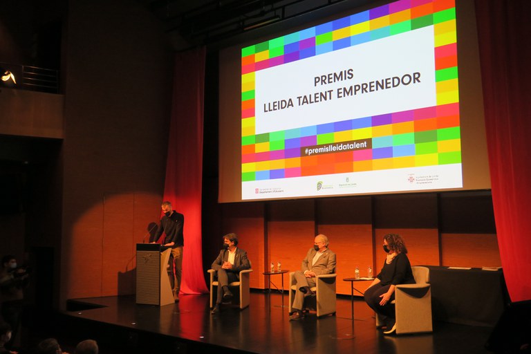 El tinent d’alcalde de Promoció Econòmica i Emprenedoria, Paco Cerdà, acompanyat del vicepresident del Patronat de Promoció Econòmica de la Diputació de Lleida, Carles Gibert, i de la directora adjunta dels Serveis Territorials del Departament d’Educació a Lleida, Maite Codina, ha presidit avui el lliurament de la 8a edició dels Premis Lleida Talent Emprenedor 2021-2022.