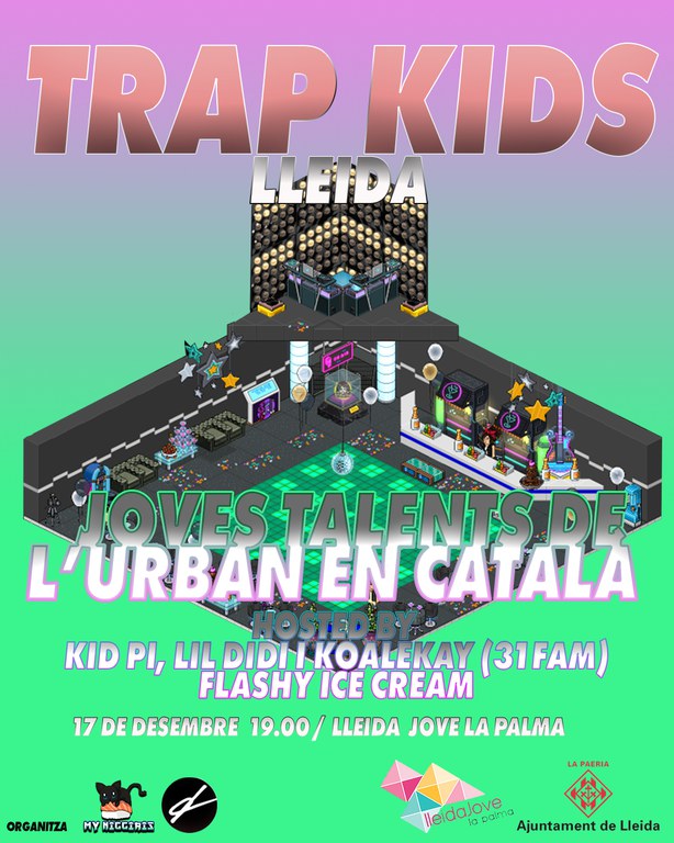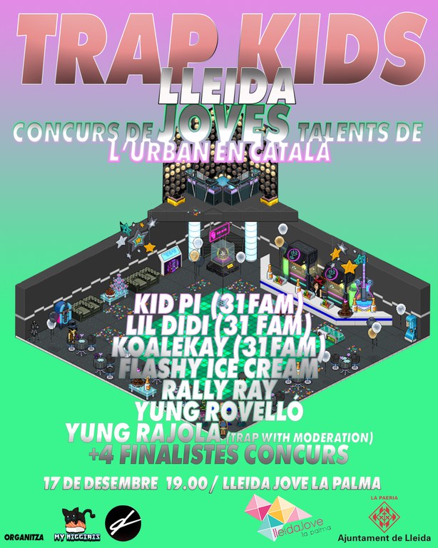 Aquest divendres 17 de desembre a les 19h tindrem en concert a 31 FAM, Flashy Ice Cream, Rally Ray, Yung Rovelló i Yung Rajola i als 4 finalistes, un de Lleida, del concurs de trap online que hem fet prèviament. Tant els grups com els finalistes, aposten per cantar trap en català. Els i les joves que vulguin assistir han de treure una entrada gratuïta a Entrapolis i disposar del certificat Covid.