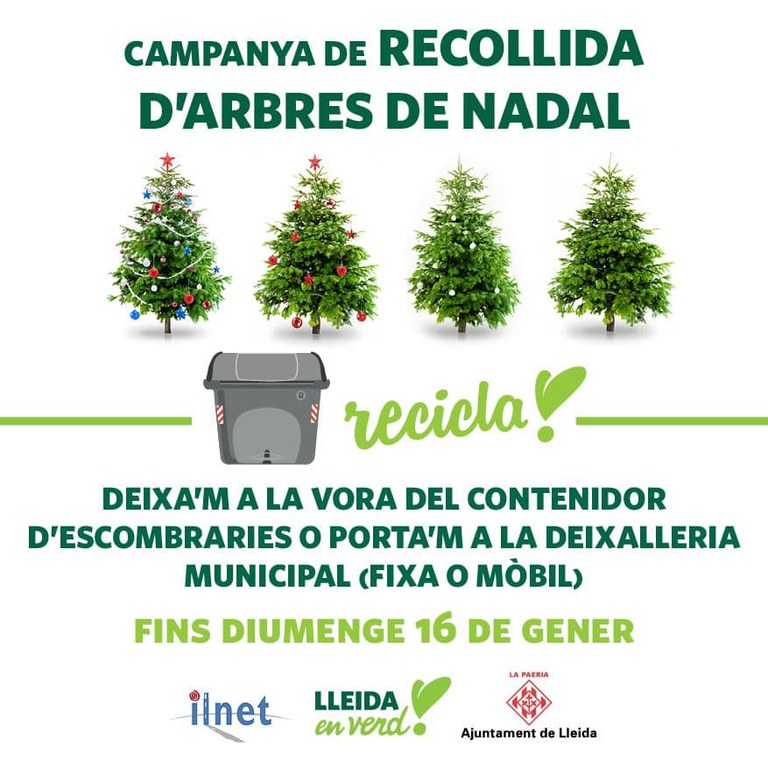L’Ajuntament de Lleida ha iniciat una nova edició de la campanya de recollida d’arbres de Nadal, que finalitzarà el 16 de gener. Durant aquest període, els arbres de Nadal naturals es poden deixar al costat del contenidor d’escombraries (no a dins) per facilitar la seva recollida als serveis municipals. També es poden portar a la deixalleria municipal, ja sigui a la fixa o a la mòbil (consulta la ubicació).