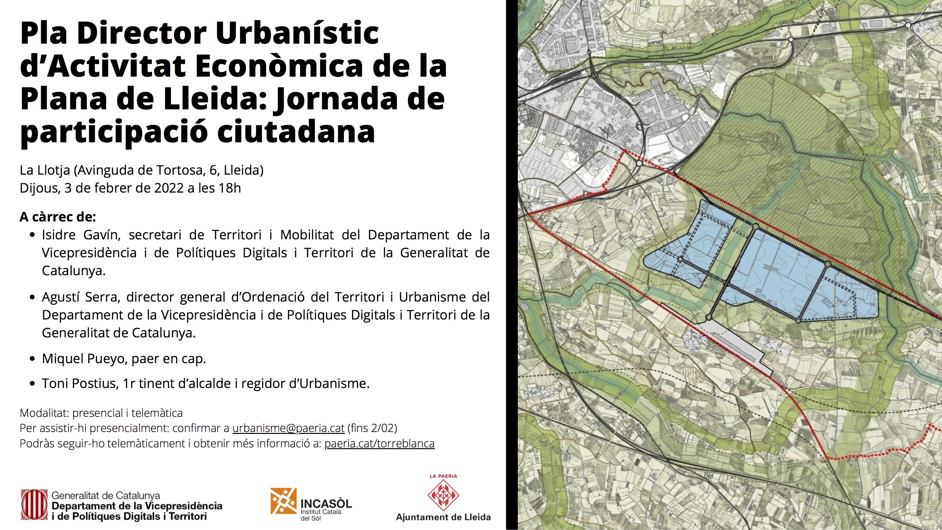 La jornada de participació sobre el PDUAE tindrà lloc aquest dijous, a les 18 h, a la Llotja de Lleida. Per assistir-hi presencialment cal confirmar a urbanisme@paeria.cat, fins al dia 2 de febrer. La sessió també es podrà seguir telemàticament a través de paeria.cat/torreblanca.