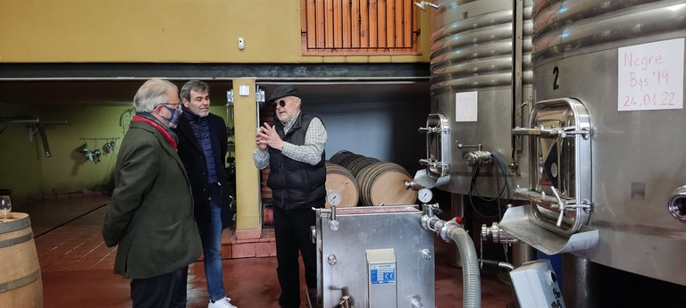 El president de Turisme de Lleida, Paco Cerdà, acompanyat del regidor de l’Horta, David Melé, ha visitat el Celler de Sanui amb l‘enòleg, Pere Escude i d’un dels socis propietaris, Francesc Roca.