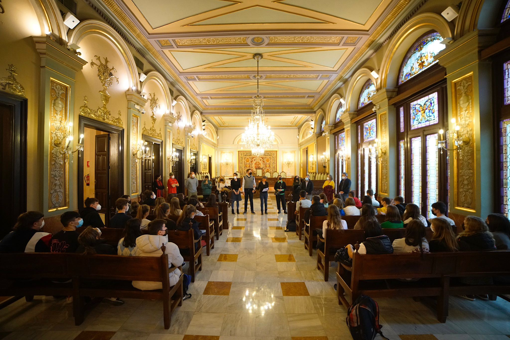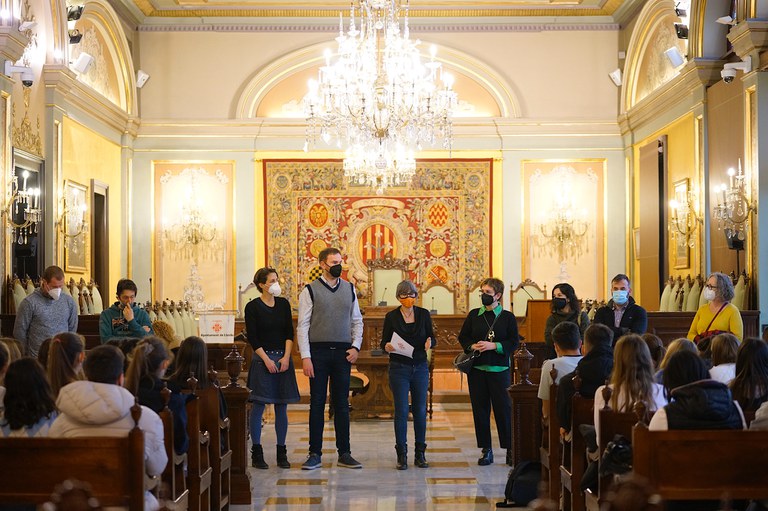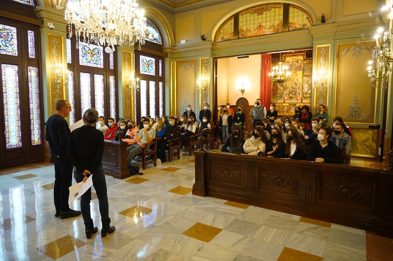 El grup que ha visitat el saló de plens ha estat integrat per 21 alumnes procedents dels tres centres estrangers, 21 alumnes de Torre Vicens que acullen els seus companys a casa seva, a més de 6 professors dels instituts foranis i 3 del Torre Vicens.
