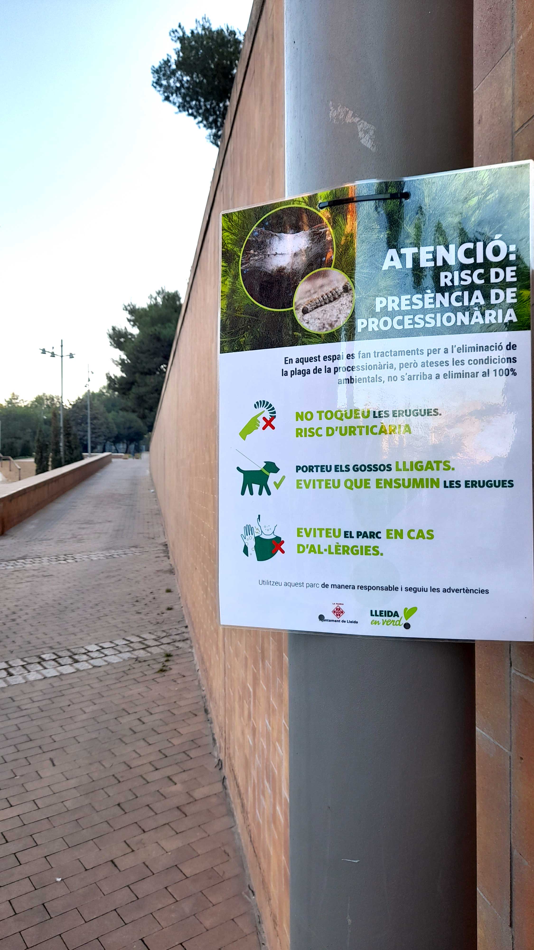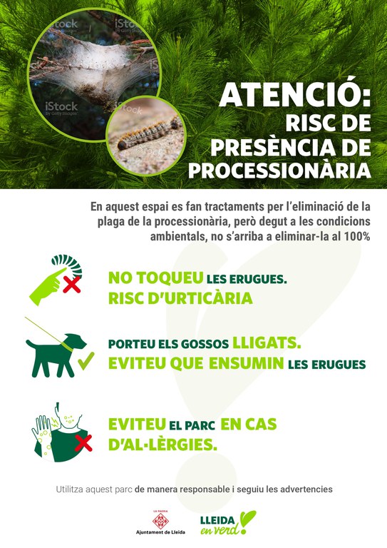 Per això, des de la Regidoria es recorda amb aquests cartells informatius fer atenció a la senyalització i, si es troba alguna bossa o processó d’erugues, comunicar-ho pels canals habituals de l’Ajuntament de Lleida, per tal d’actuar en la zona.