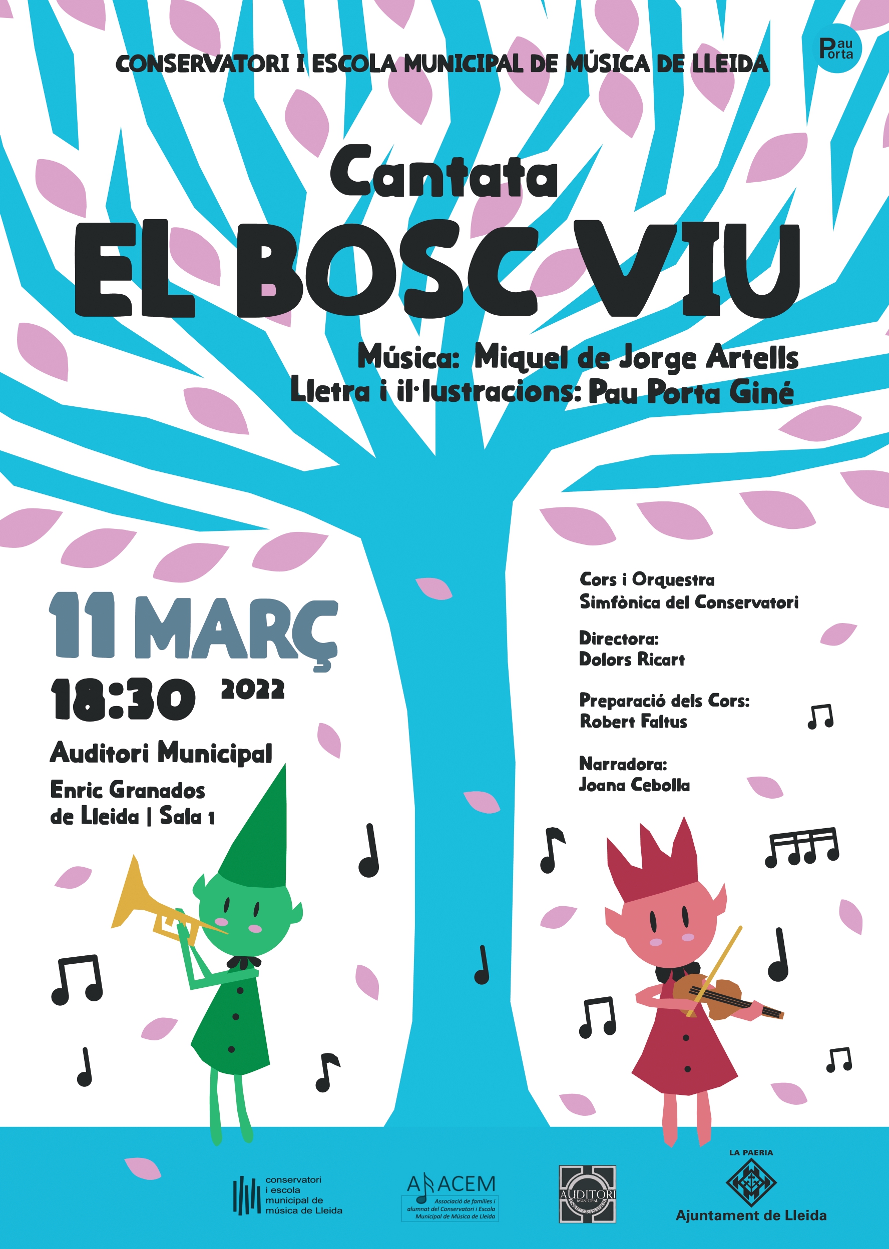 L'Auditori Municipal Enric Granados acull demà, a les 18.30 h, l'estrena de la cantata "El bosc viu" del violinista i compositor Miguel de Jorge Artells, qui va iniciar la seva carrera musical als 7 anys en el Conservatori Municipal de Lleida. La lletra de la cantata, la narració que l'acompanya i les il·lustracions són a càrrec de Pau Porta Giné.