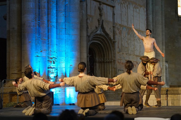 La tinent d’alcalde Jordina Freixanet assenyala que aquest és un temps que convida a reflexionar sobre el món inhòspit en què vivim i que ens interpel·la a treballar per la solidaritat i l’entesa entre persones i pobles El periodista i historiador Jordi Curcó llegeix un pregó en què va introduint les actuacions de diverses entitats del món de la Cultura Popular i Tradicional de la ciutat L’Esbart Dansaire del Sícoris Club clou l’acte amb la representació de ‘La Moixiganga’, mentre repiquen les campanes de la torre de la vella catedral