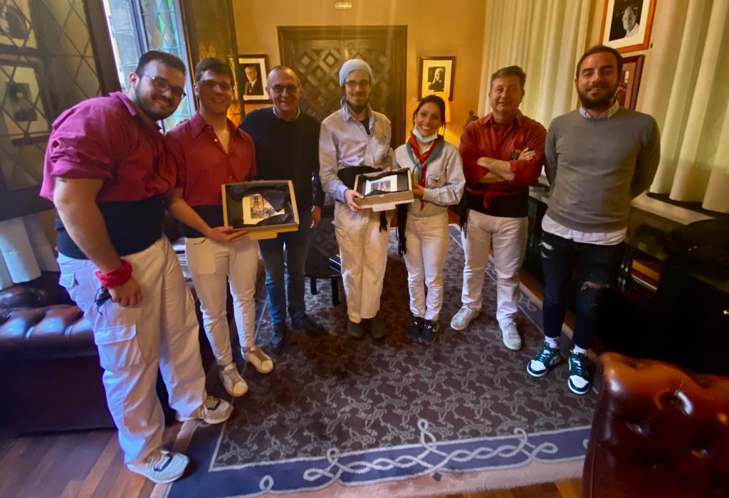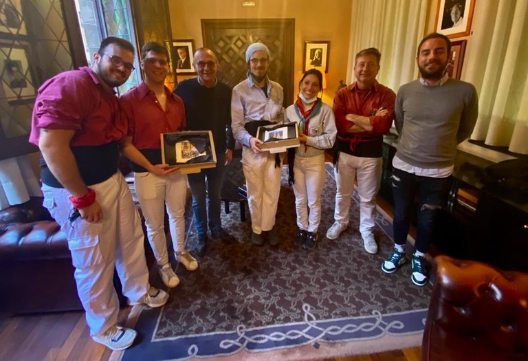 L’alcalde de Lleida, Miquel Pueyo, acompanyat del regidor de Joventut, Festes i Tradicions, Ignasi Amor, i del també paer Joan Ramon Castro, que ha compaginat la tasca institucional amb la de membre de la colla bordeus, han fet pinya amb els castellers i els han desitjat sort en aquesta temporada que tot just comença.