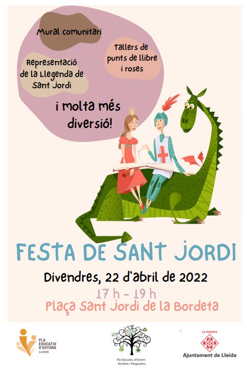 La Comissió escola-entorn de la Bordeta ha preparat la festa de Sant Jordi per al divendres 22 a la tarda amb la participació d’infants i joves del barri. A partir de les 17 h i fins les 19 h es faran diverses activitats a la plaça de Sant Jordi -davant dels Bucs-, vinculades a aquesta diada i obertes a la ciutadania. Hi haurà tallers de creació de punts de llibre i de roses, parades de llibres i es narrarà la llegenda de la festivitat, accions promogudes per la Ludoteca, Salesians Sant Jordi i Educadora d'entorn.