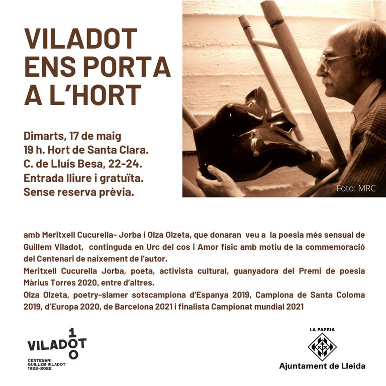 Aquest dimarts, a les 19 hores, l’Hort del convent de Santa Clara, acollirà “Viladot ens porta a l’hort” amb Meritxell Cucurella- Jorba i Olza Olzeta. Aquest acte, que estava inclòs en el programa de Sant Jordi i que s’havia de celebrar el 20 d’abril, va ser ajornat per les inclemències meteorològiques.