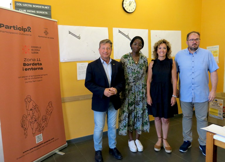 La regidora de barri, Mariama Sall; el regidor de Mobilitat, Joan Ramon Castro, i la regidora de Participació, Marta Gispert, acompanyats del membre de la comissió de treball d’aquest projecvte, Rafa Sopena, han presentat avui la darrera fase de la consulta en què es posa a disposició de la ciutadania una enquesta perquè pugui participar i expressar la seva opinió sobre la pacificació d’aquest tram del carrer Hostal.
