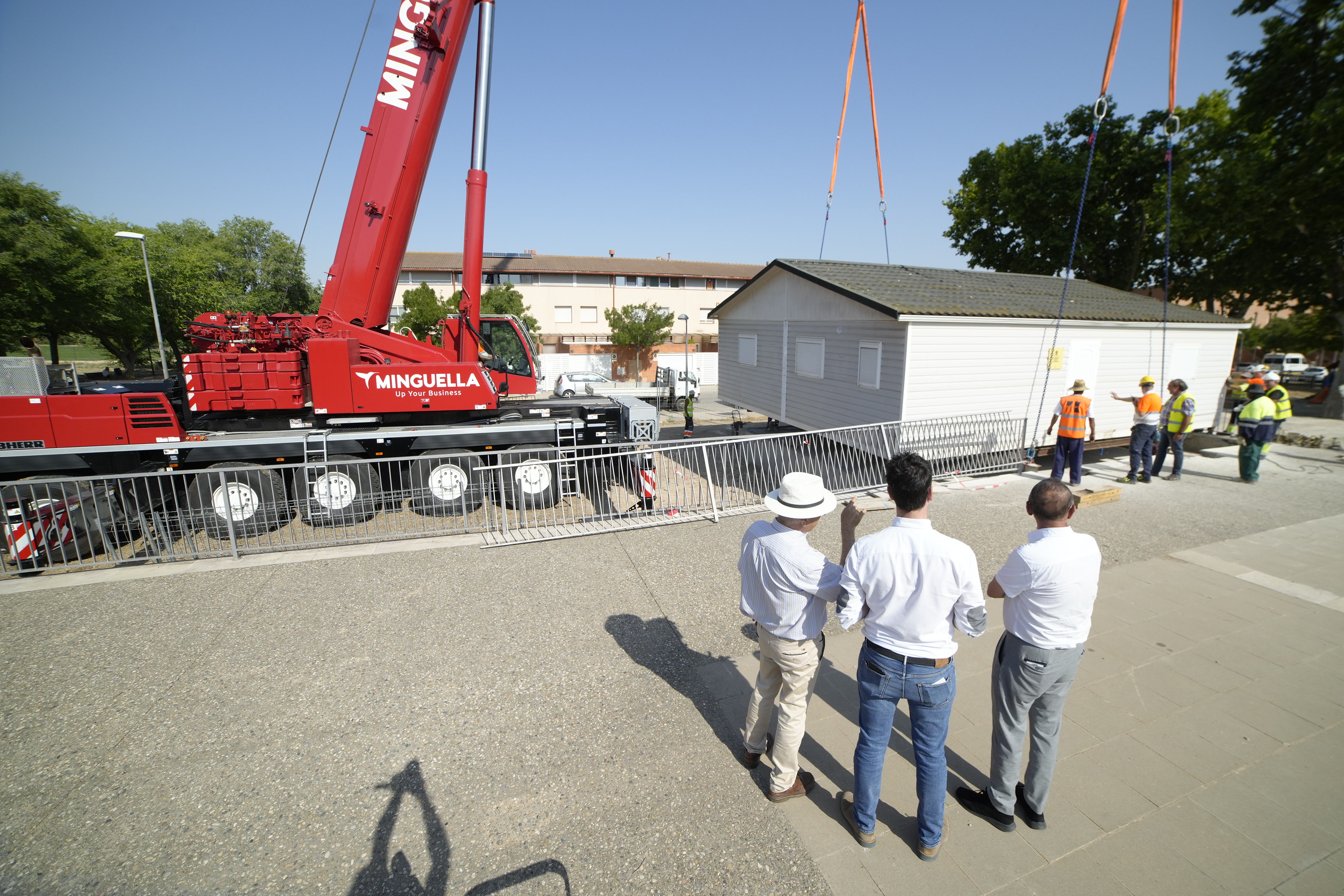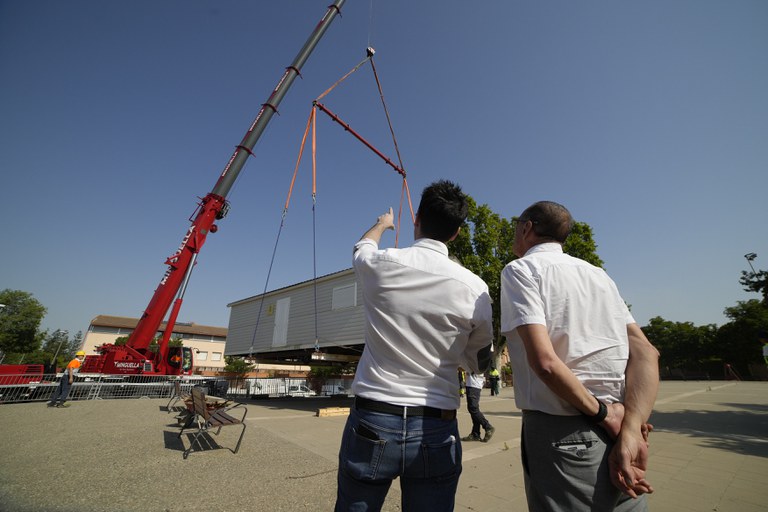El paer en cap, Miquel Pueyo, i el primer tinent d’alcalde, Toni Postius, han visitat avui les tasques per moure aquesta estructura prefabricada amb una gran grua, actuació que permetrà ampliar la plantació d’arbres al parc de Ciutat Jardí