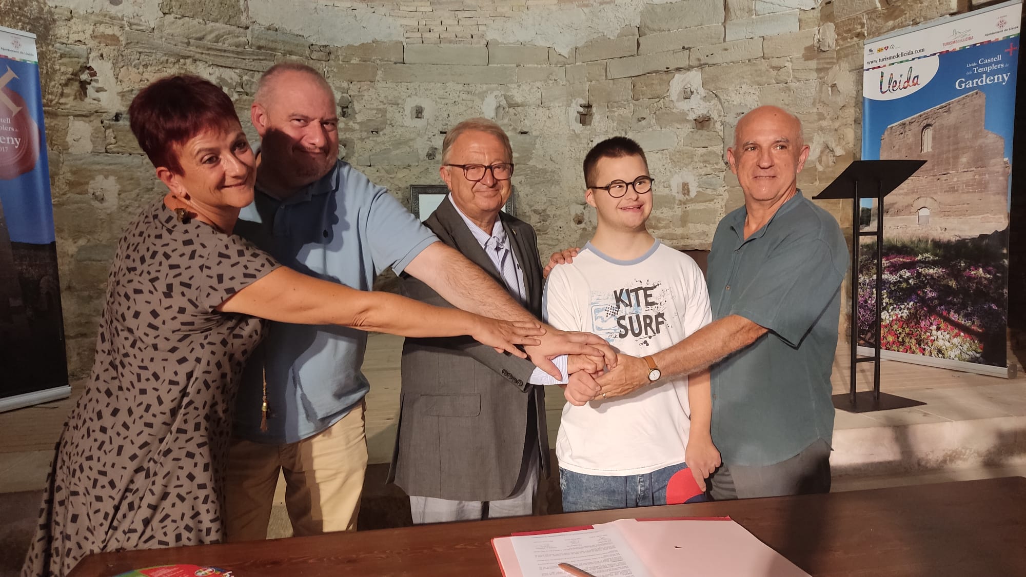 El tinent d’alcalde i president de Turisme de Lleida, Paco Cerdà, i la presidenta i vicepresident de l’Associació Down Lleida, Olga Parés i Antonio Ramírez, han signat un conveni de col·laboració perquè es puguin integrar laboralment persones amb síndrome de Down a l’hora de fer la recepció i l’atenció de les persones que venen a fer turisme a la ciutat de Lleida. Joan Conejo, un dels membres de l’associació, farà d’agent d’informació turística al Castell dels Templers de Gardeny i comptarà amb el seguiment i la formació que li facilitarà Turisme de Lleida.