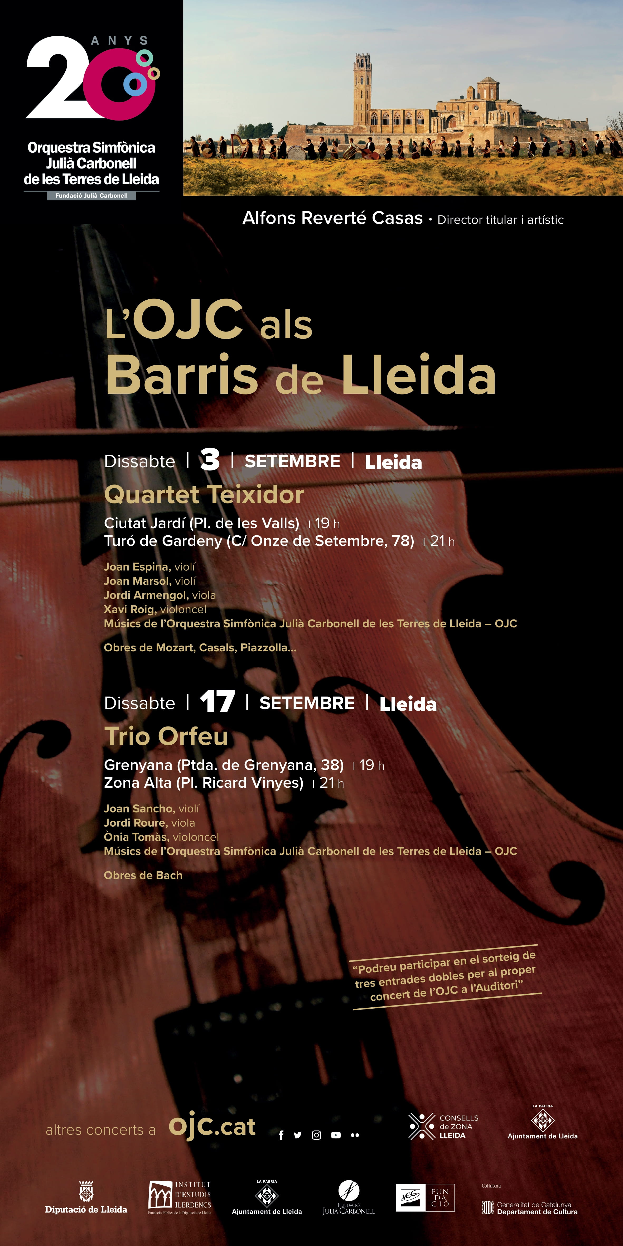 Aquest programa es va iniciar l’any passat, amb tres edicions que van portar la música de l’OJC als barris Pardinyes, Balàfia, Bordeta, Magraners, Ereta , Cappont, Mariola, Joc de Bola, Clot de les Granotes, Universitat, Balàfia, Noguera, Partida de Montserrat i les EMD’s de Sucs i Raimat.