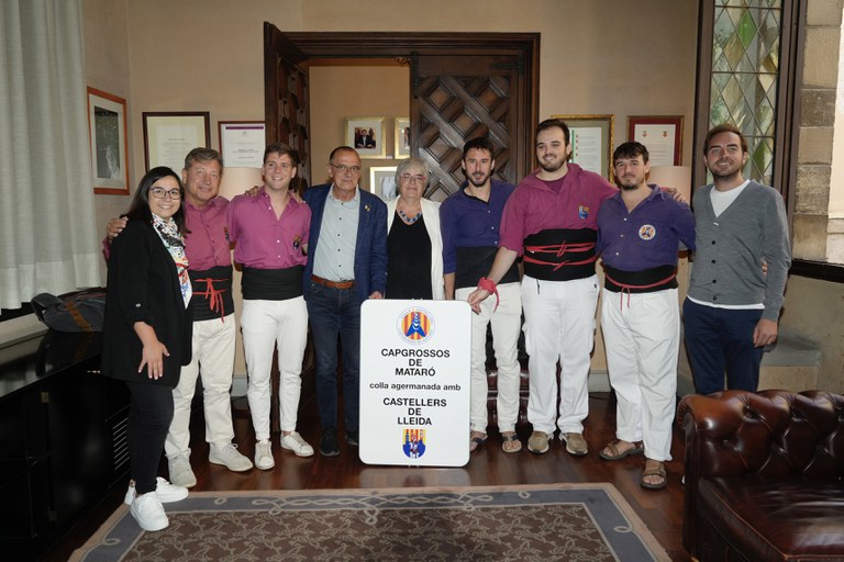 El paer en cap, Miquel Pueyo; el regidor de Festes i Tradicions, Ignasi Amor, i la tinent d’alcalde Jordina Freixanet, juntament amb els regidors Joan Ramon Castro i Carme Valls, han assistit a la diada i han saludat els caps de colla al despatx noble de la Paeria en finalitzar les seves actuacions. Ha estat llavors quan els Castellers de Lleida han lliurat als Capgrossos una placa amb motiu de l’agermanament d’ambdues colles, amb qui fa més de 20 anys que comparteixen plaça.