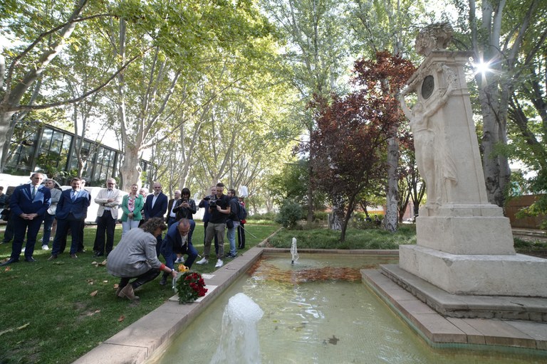 L’acte ha consistit en la hissada de la bandera de la ciutat al recinte firal, davant del Palau de Vidre, i en l’ofrena floral a l’escultura de l’alcalde Fuster, un paer en cap que “va transformar la ciutat”, com ha remarcat Miquel Pueyo.