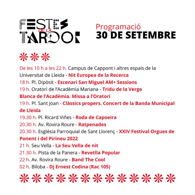 L’avinguda Rovira Roure, amb “Band The Cool”; la Pista de la Panera, amb revetlla popular; la plaça Sant Joan, amb un concert de la Banda Municipal, i la plaça del Dipòsit, amb San Miguel AM+ SessionsEl XXIV Festival Orgues de Ponent i del Pirineu 2022, la Seu Vella de nit o la Nit Europea de la Recerca, altres propostes de la jornada d’aquest divendres