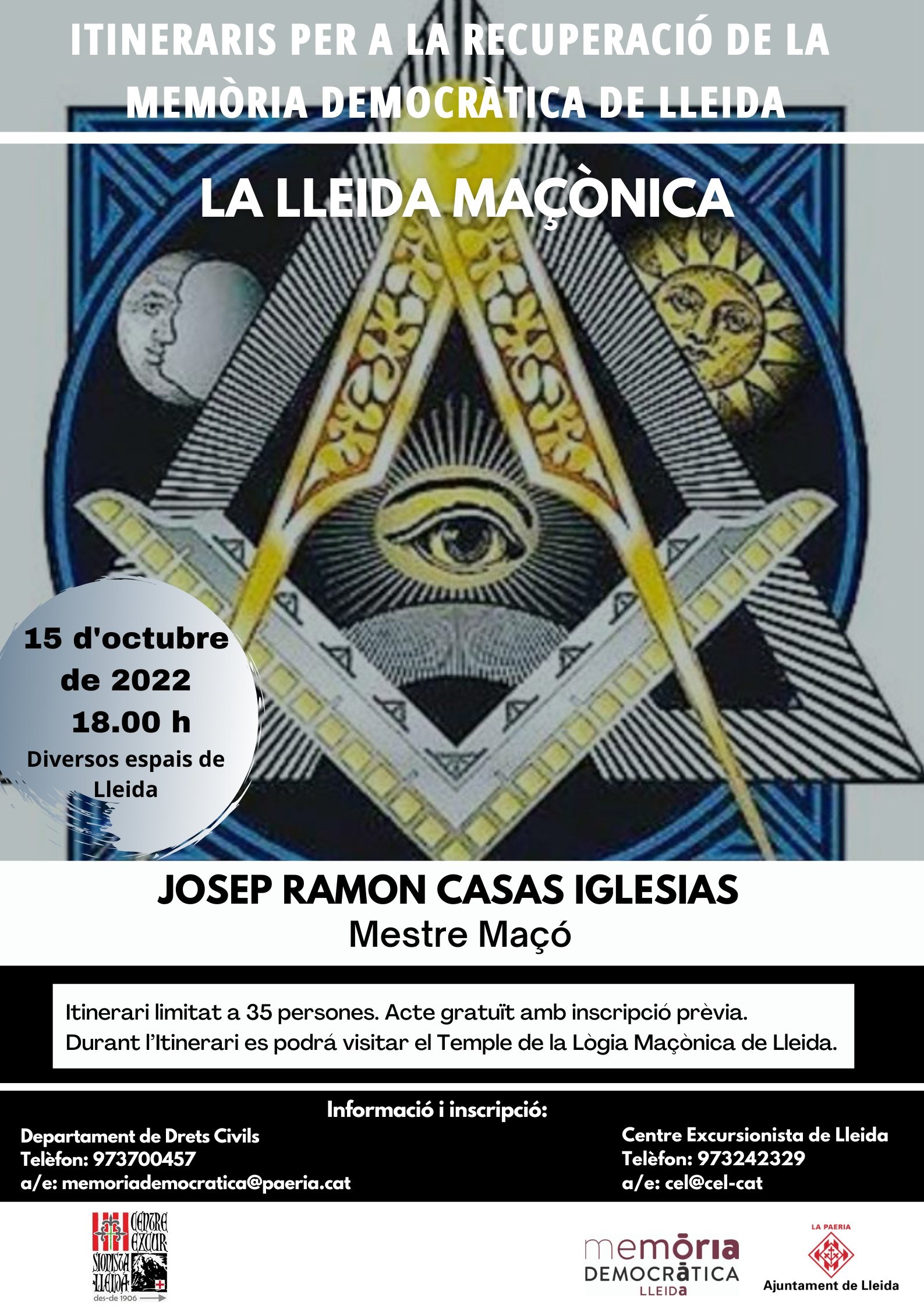 L’Ajuntament de Lleida ha organitzat un nou itinerari per a la Recuperació de la Memòria Democràtica que es farà aquest dissabte, 15 d’octubre. El Departament de Drets Civils ha preparat “La Lleida maçònica”, itinerari que serà guiat pel mestre maçó Josep Ramon Casas Iglesias. Les places per assistir-hi ja s'han exhaurit.