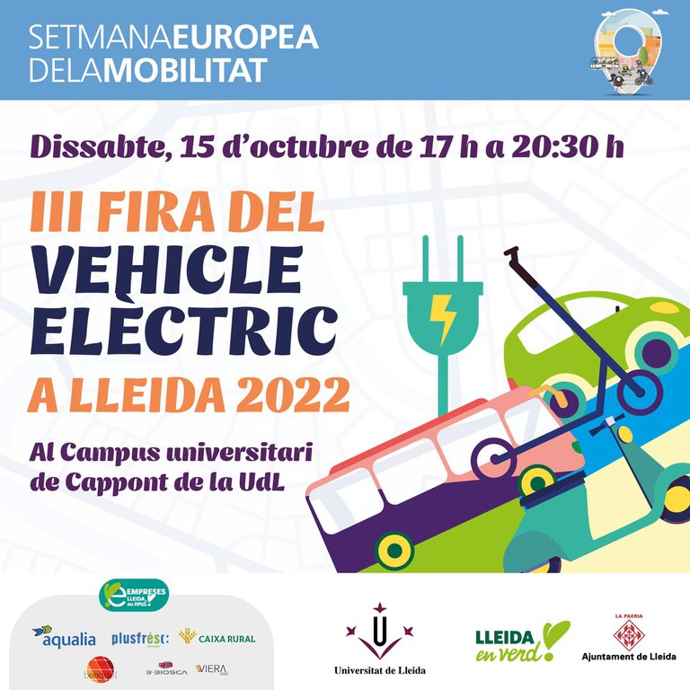 Lleida acull aquest dissabte a la tarda la III edició de la Fira del Vehicle Elèctric, un certamen organitzat per la Paeria i la Universitat de Lleida en el marc de les activitats de la Setmana Europea de la Mobilitat Sostenible 2022. L’objectiu d’aquesta iniciativa és promoure la mobilitat elèctrica com a part de la solució al repte de l’emergència climàtica a la que ens enfrontem actualment.