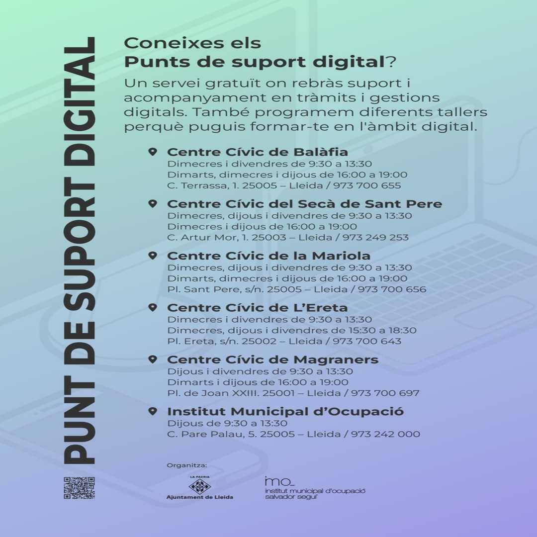 Aquests tallers, impulsats de forma conjunta per les àrees de Serveis Digitals, Participació i l’Institut Municipal d’Ocupació, formen part del projecte de Punts de Suport Digital, que ja estan en marxa a cinc centres cívics de la ciutat, els de Balàfia, Mariola, l’Ereta, el Secà de Sant Pere i Magraners, i com a complement a l'acompanyament que hi realitzen els connectors digitals. Són aquests cinc espais els que acolliran aquestes activitats, organitzades a partir d’un pla formatiu estructurat en vuit mòduls independents d'una hora i mitja cadascun, que anirà rotant pels diferents centres cívics de forma mensual fins al mes de febrer.