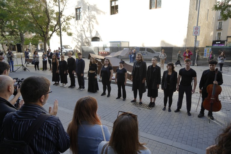 L’acte ha comptat amb una actuació musical i escènica per part d’alumnat de les escoles municipals. D’una banda, l’alumne de violoncel del Conservatori Municipal, Hugo Herraiz, ha interpretat “El Cant dels Ocells”, de Pau Casals. Alumnes de l’Aula Municipal de Teatre han fet l’acompanyament escènic. Han estat Dalia Bereoaie, Lua Gabarró, Clàudia González, Marem Gueye, Júlia Jiménez, Ares Perera, Xavier Rami, Sara Serrat, Cristian Soares, Daniel Turashev, Robert Vilaseca, amb la direcció artística de les professores Ares Piqué i Marta Casals.