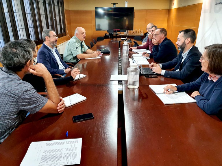El Paer en Cap, Miquel Pueyo, i els regidors de Transició Ecològica, Jaume Rutllant, i de l’Horta, David Melé, han mantingut avui una reunió de treball a la Paeria amb el director d’Interior a Lleida, Xavier Garròs, i el cap dels rurals, Llorenç Ricou, per avaluar com minvar els danys que causen als cultius els senglars, els conills i les cotorres