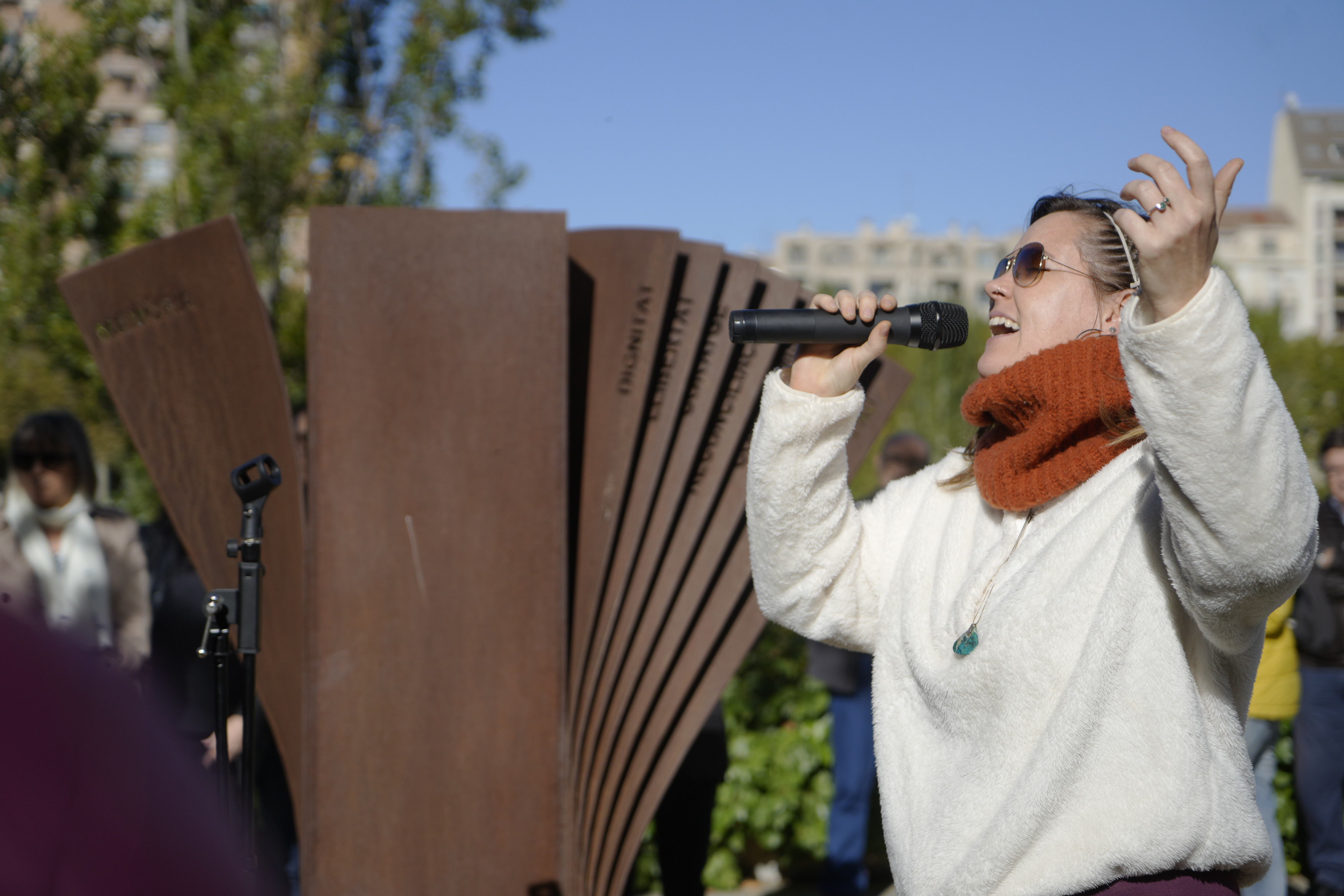 En finalitzar l’acte de la Paeria, tots junts s’han desplaçat fins a l’escultura FITA. Monument que recorda a les víctimes del nazisme i davant del qual s’ha fet una ofrena floral, acompanyada de les interpretacions musicals de la cantant lleidatana Tui Higgins, que ha interpretat les cançons ‘Wiegala’ i ‘Morir a Ravensbrück’.