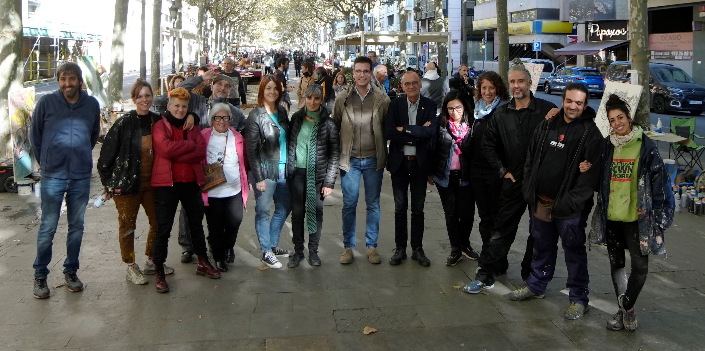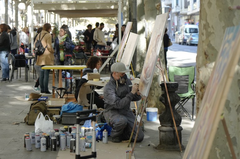 Amb el lema ‘Ramblejar’, promouen un seguit d’actes al carrer per recuperar aquest espai emblemàtic de la ciutat a nivell cultural, cívic i ciutadà i retornar-li la vida que li ha estat privada en els darrers anys L’alcalde Miquel Pueyo saluda els artistes que hi participen en l’exhibició d’street art